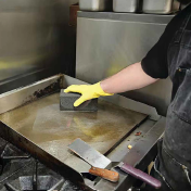 The Grill Brick from Globe is used to clean up immediately after cooking, while your grill is still hot, so it's ready for next time. It removes the black residue that a grill scraper will not get off. Unlike a scraper, with light pressure, it is gentle, yet abrasive to effectively remove grease and residue without causing damage to anti-stick, grill, or griddle surface coatings. You can apply cooking oil to protect the grill cure and remove excess cooked-on foods. For thorough cleaning with less effort, use this commercial-grade, heavy-duty grill cleaning brick!