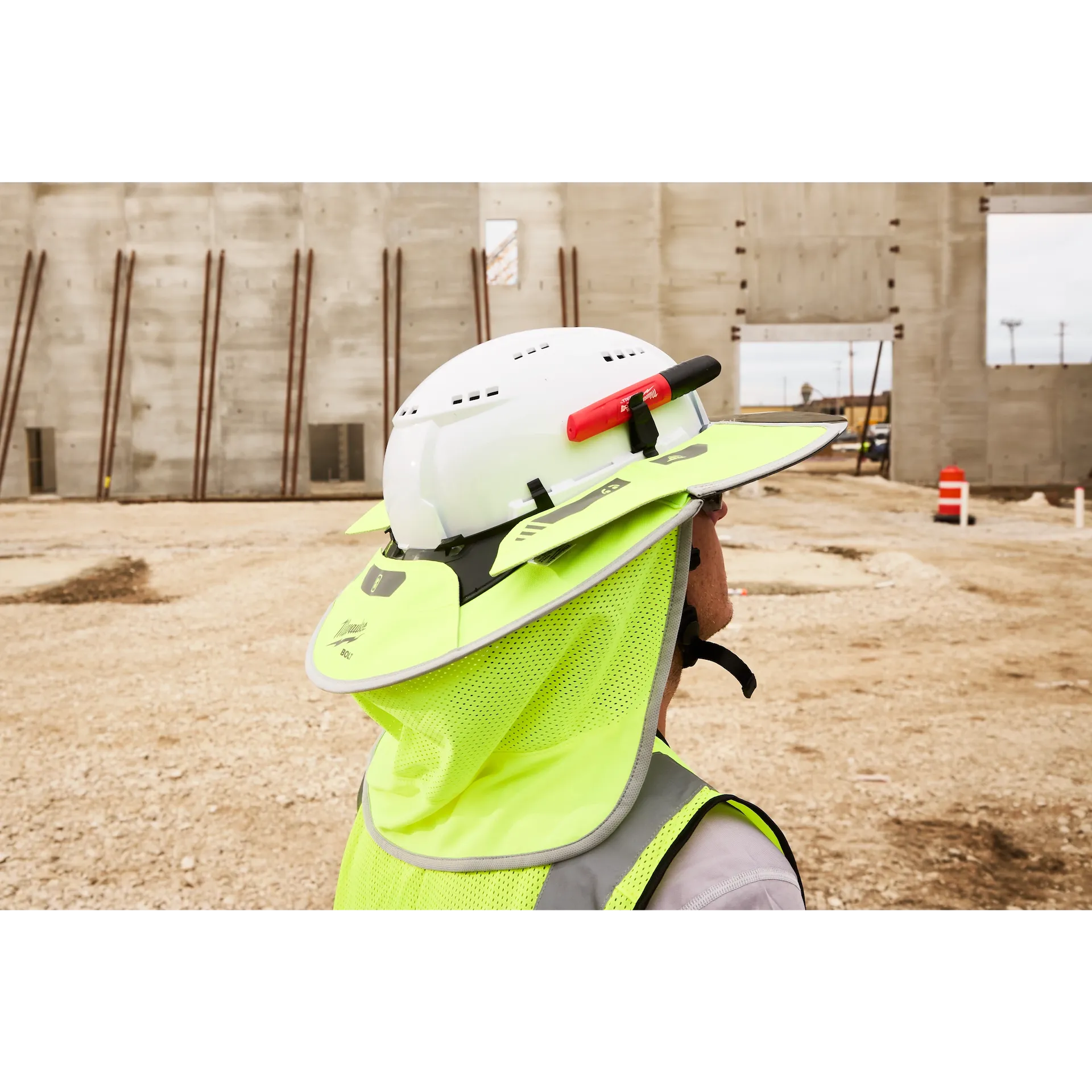 The Milwaukee BOLT™ Sun Visor with Sunshade provides 360° UV protection and everyday wear. Securely clip into any MILWAUKEE® Safety Helmets and Hard Hats. The Milwaukee® Sun Visor with Sunshade is designed with a tinted brim to reduce glare without reducing your upward vision. The mesh portion keeps you cool. The front visor can be used with a face shield or eye protection when flipped back into retention slots. The dedicated earmuff and rear accessory slots allow you to use additional BOLT ™ accessories simultaneously.