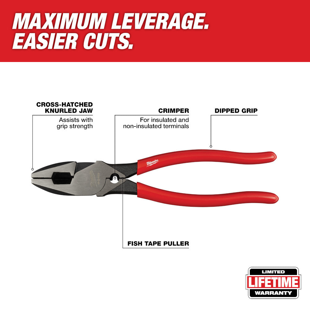 9-inch High-Leverage Lineman’s Pliers with Crimper are designed to have maximum leverage and make easier cuts. These high leverage pliers feature hardened iron carbide cutting edges, with optimized pivot designed to allow you to cut ACSR, hard wire, and soft wire with ease. The on-board crimper can be used for insulated and non-insulated electrical terminals. The lineman's pliers also feature a fish tape puller. Milwaukee stands behind their product and offers a Limited Lifetime Warranty with all locking tools.