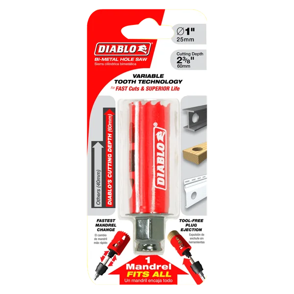 Freud Diablo DHS1000 1" x 2-3/8" Bi-Metal Mandrel Shank Hole Saw is one of Diablo's new, high-performance hole saws that deliver faster cutting performance and increased productivity. Unlike anything on the market; Diablo's hole saw system and mandrel design simplify the attachment process for a fast and efficient hole saw mounting. These radical new hole saws provide ultimate cutting length to bore deeper holes in a single pass; tool-free plug ejection and Variable Tooth Design for faster cuts.