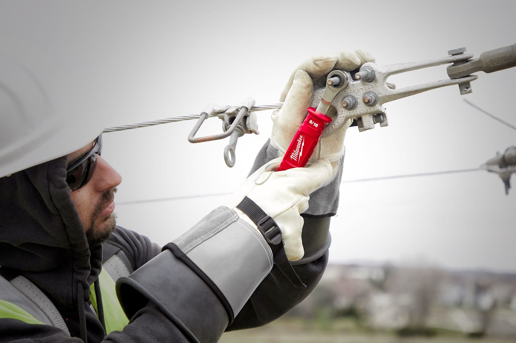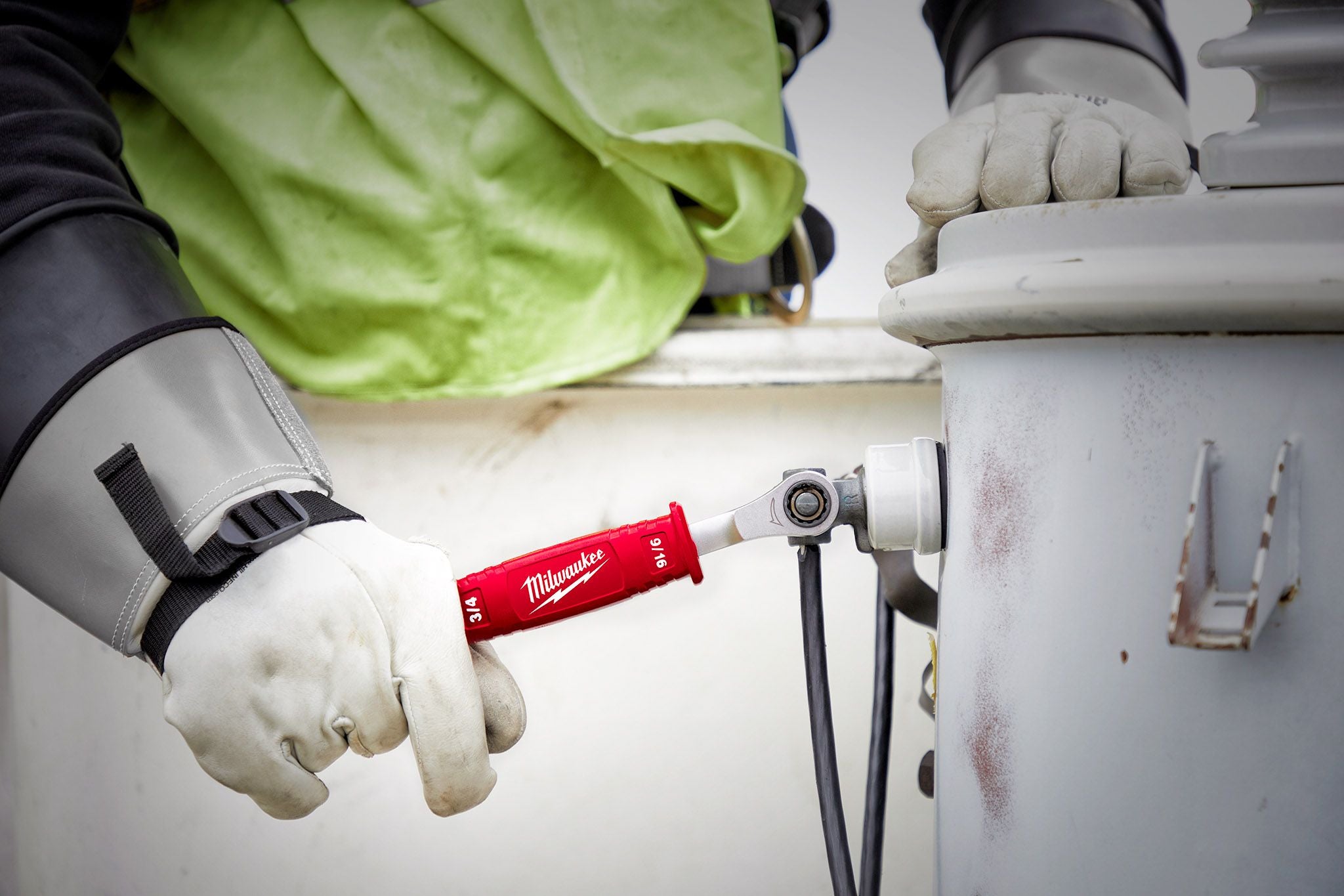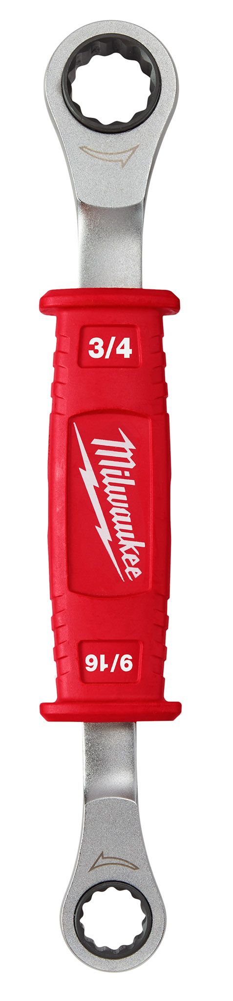 Milwaukee's Lineman's 2in1 Ratcheting Insulated Box Wrench is 1000V UL Classified. Durable forged steel construction gives your tool longer life while high contrast size markings let you identify size easier. The ratcheting wrench's ergonomic handle is designed to provide you with comfortable use while wearing gloves and still allows for easy storage. The box wrench features twelve-point sockets that fit 9/16" and 3/4" hardware.