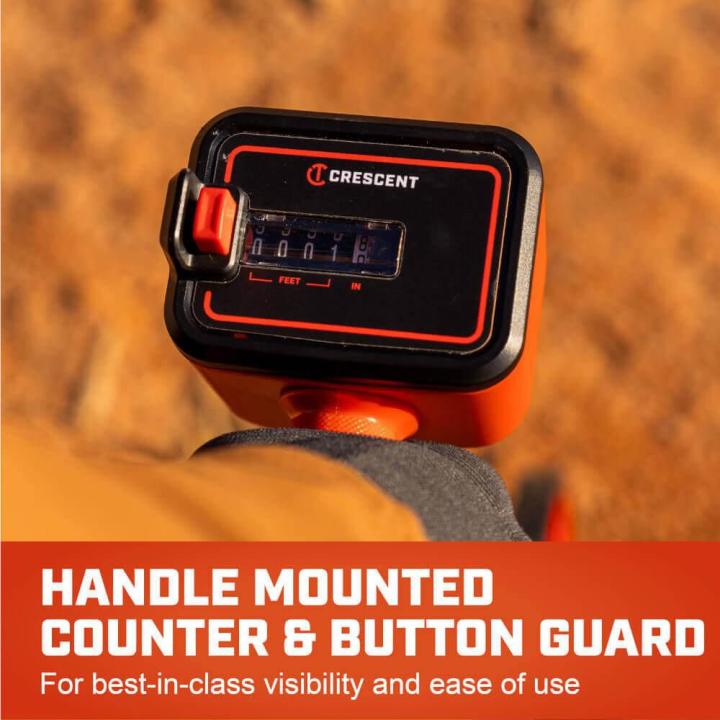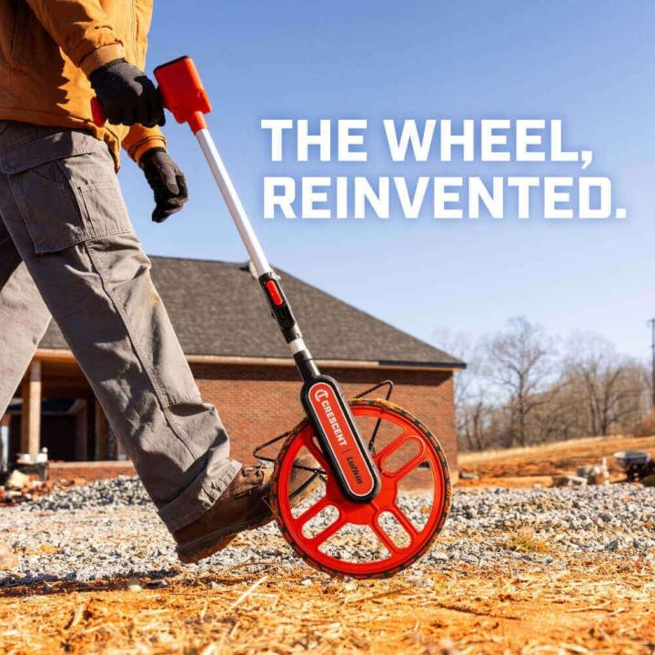 The Crescent 12" Measuring Wheel features a handle-mounted counter providing clear visibility of the measurement and accessibility to the reset button. Its centerline design and pistol grip handle provides balance and comfort while measuring long distances. The folding kickstand holds the wheel upright when hands need to be free for other tasks. Additionally, the measuring wheel folds to a compact size for storage.