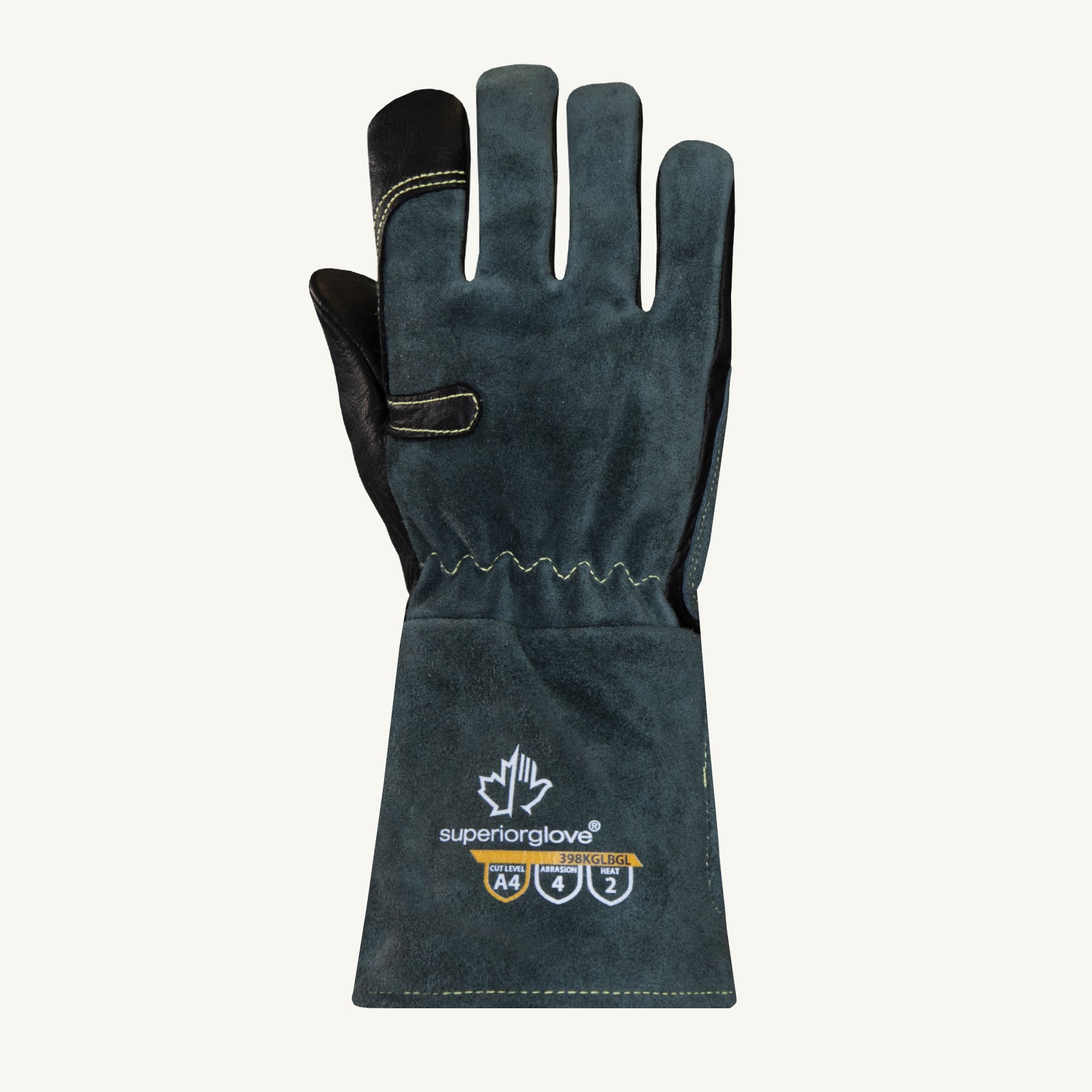 These Endura® 398KGLBG MIG welding gloves are designed with a slim fit for comfort plus protection against heat and cuts. ParaActiv™ engineered yarn liner provides 360° cut protection with ANSI A4 cut resistance while back-of-hand fleece lining offers ANSI 2 heat protection. Dark coloring hides dirt and stains for a longer wear life plus extended 6-inch cuffs offer added wrist and forearm protection. Padded palm patches offer further comfort when material handling.