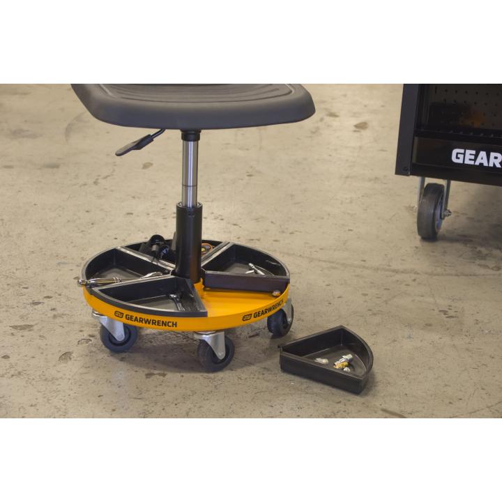 GEARWRENCH work seats and stools let you work comfortably at a level that gives you maximum access and leverage, whether working at low heights or doing bench work. A rolling work seat and a high stool are both available to suit your shop environment needs and personal working style. Both are air shock height adjustable and made to stand up to the hard demands of auto shop or industrial plant environments.