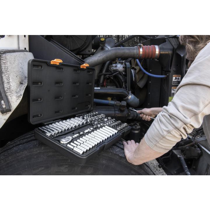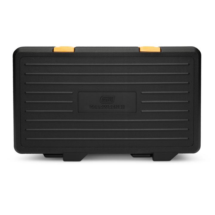 GEARWRENCH 80550 is a 57 piece 3/8-inch drive 6 point sae/metric socket set which includes a ratchet that features a low profile head and flush mounted reversing lever for greater access, as well as a second stubby full-polish teardrop ratchet for added versatility. The sockets feature large hard-stamped part numbers and size on both sides of the socket allow for easier viewing of the socket sizes, and double lines (sae) and knurled lines (metric) for easy sae vs. metric identification. Made of full polish, nickel chrome plated alloy steel, the sockets in this set are backed by a lifetime manufacturer's warranty.