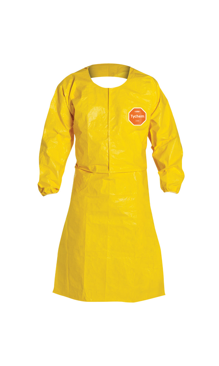 Apron - DuPont Tychem® 2000 Sleeved, Elastic Wrists, 44" Long, Neck Loop w/ Snaps & Waist Ties, Bound Seams, Yellow (Case of 25) QC275B - S is currently out of stock.