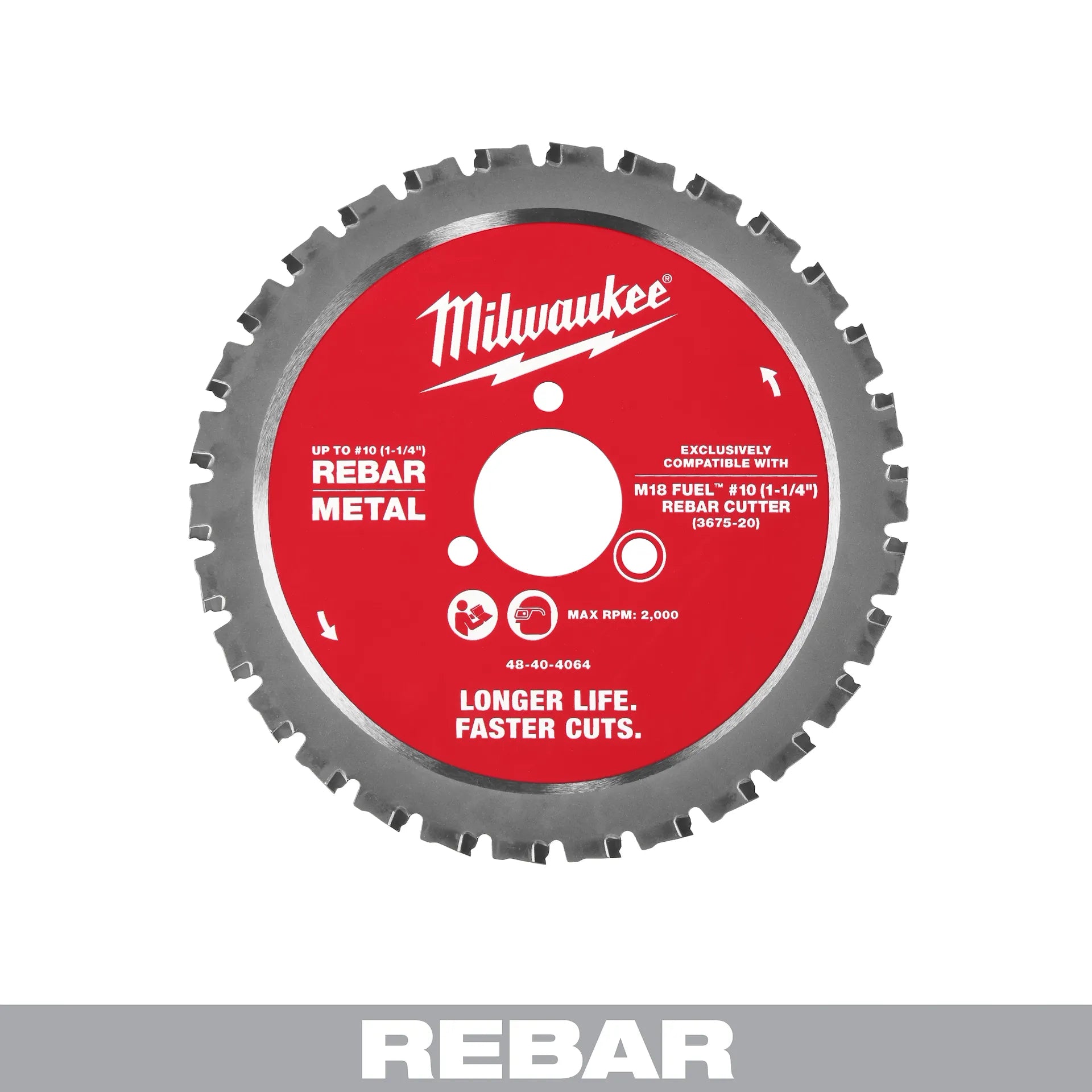 The #10 (1-1/4") Rebar Cutting Blade provides longer life and faster cuts in rebar. The cermet-tipped carbide teeth offer increased durability and cold cuts with fewer sparks than abrasives. This rebar cutting blade, when paired with the exclusively compatible M18™ FUEL™ #10 (1-1/4”) Rebar Cutter, cuts up to #10 rebar. The blade cuts through rebar, threaded rod, and black iron pipe, and is available in 1, 5, and 10 packs. Max RPM is 2,000.