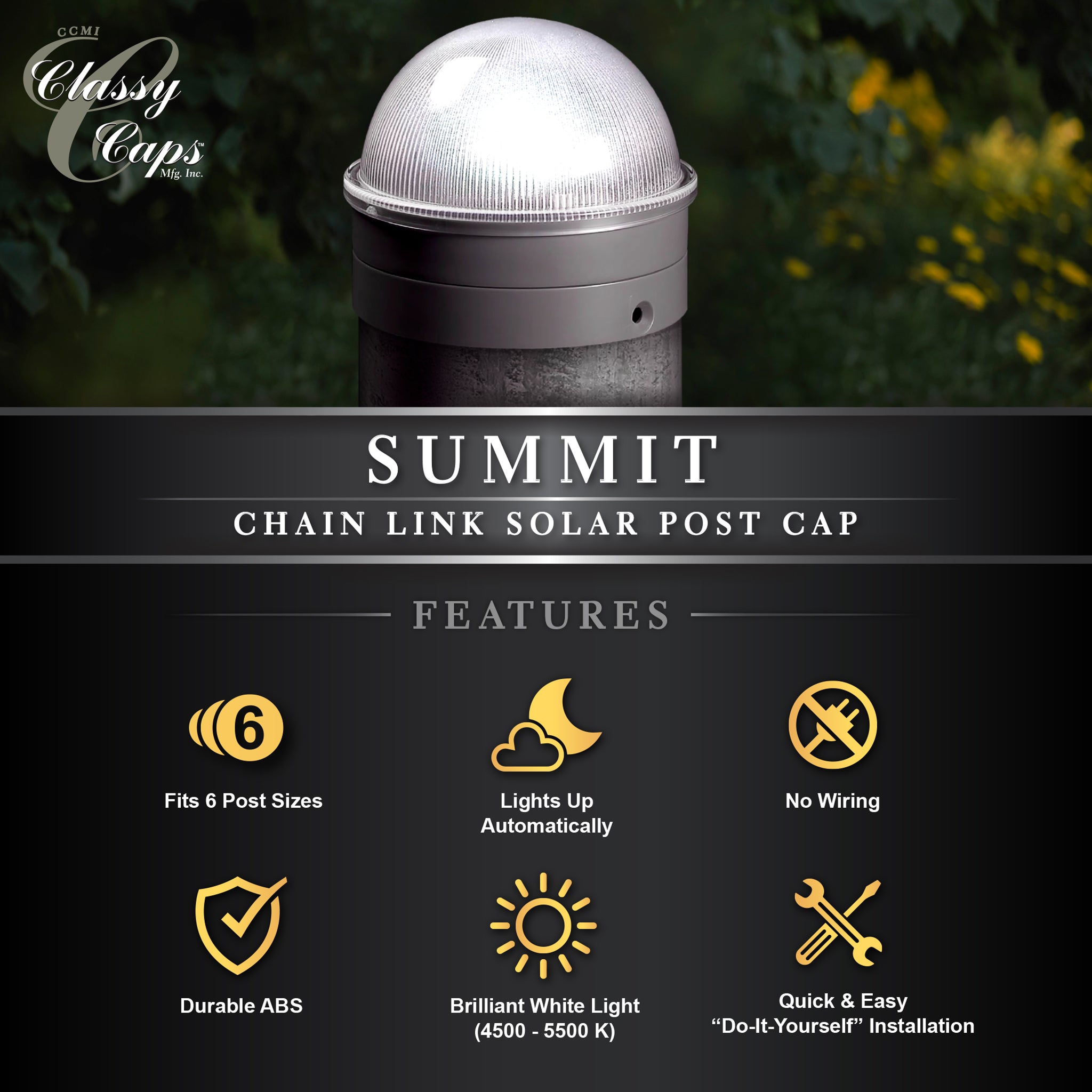 Add a touch of class to your chain link fence with our high performance Summit solar post cap. This one of a kind design by Classy Caps will compliment your existing chain link posts. Turns on automatically every night casting a brilliant white light onto the surrounding area. Manufactured to fit over six standard chain link fence posts - 3” dia., 2-7/8” dia., 2.5” dia., 2 – 3/8” dia., 2” or 1-7/8” dia.