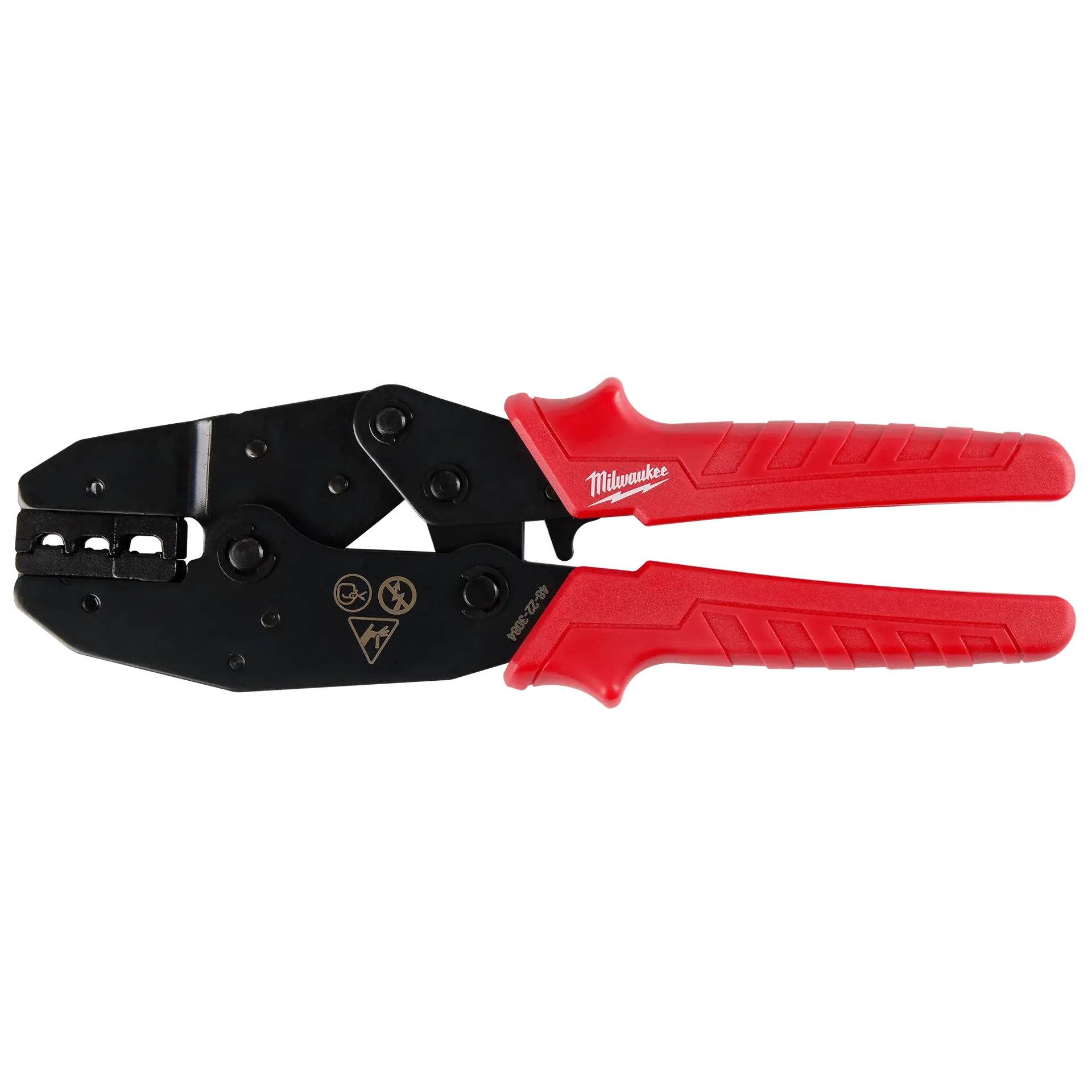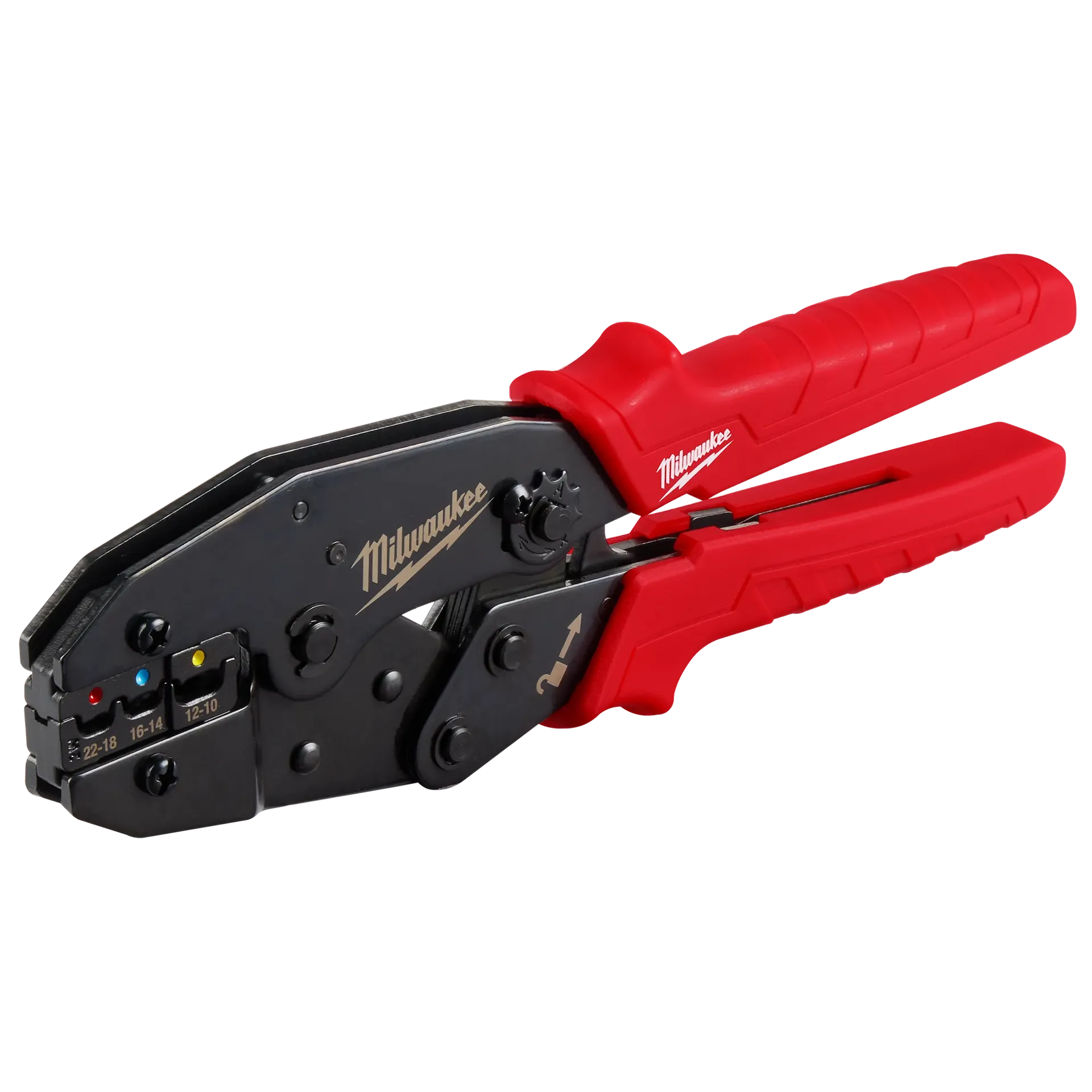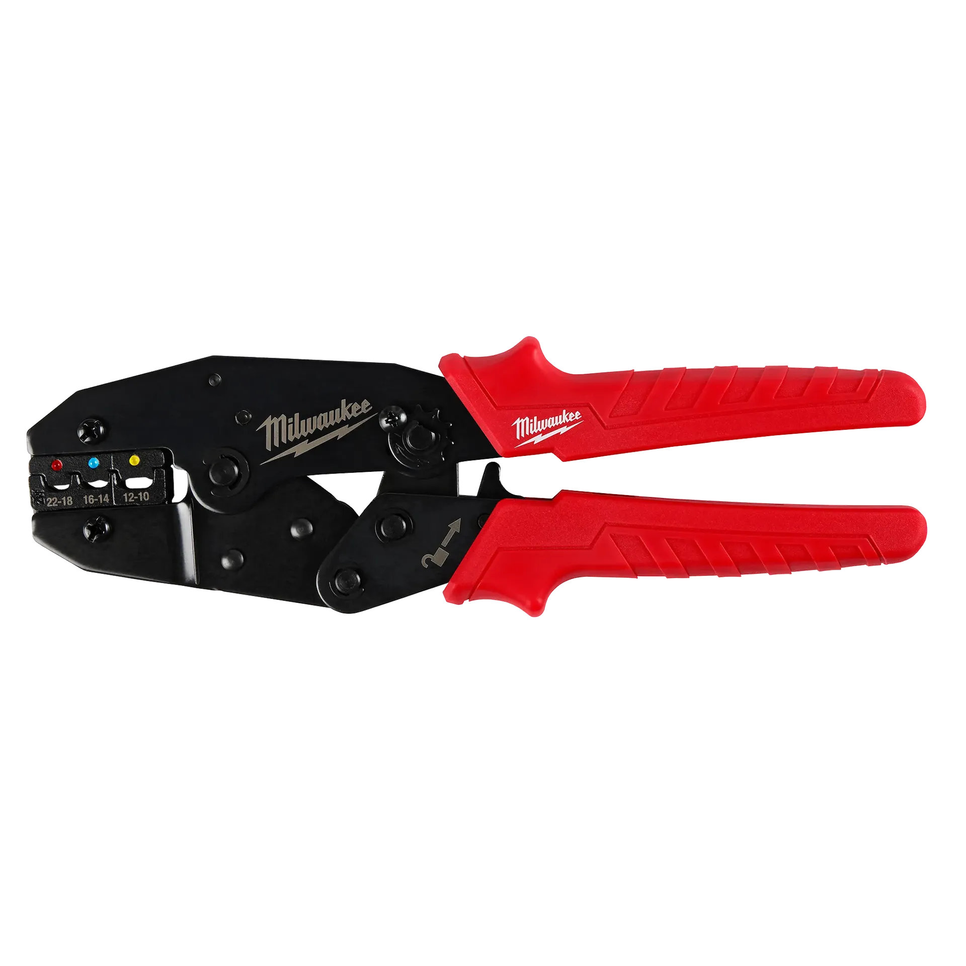 Milwaukee's Ratcheting Insulated Terminals Crimper delivers secure crimps for insulated wire terminals. The compound ratcheting action provides a complete crimping cycle to maintain a high terminal pull-off force. Three crimping cavities provide versatility for 22-18 AWG (red), 16-14 AWG (blue), and 12-10 AWG (yellow) insulated terminals. This tool also features high-contrast color-coded markings to provide increased visibility.