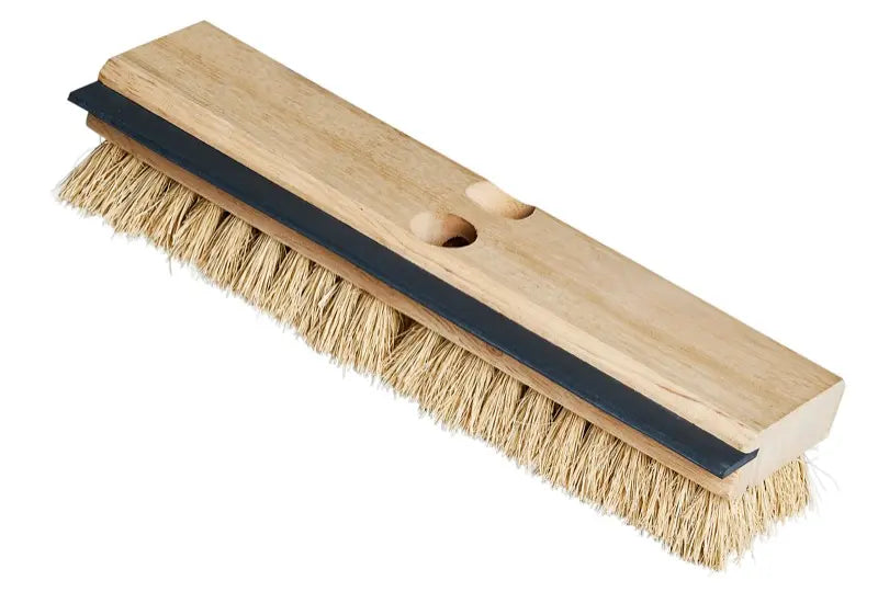 11" Wood Deck Brush ideal for cleaning floors and rough surfaces. The densely packed, white Tampico fibres are excellent for scrubbing away heavy soils and stains. The brush is also equipped with a robust squeegee which helps wiping floors clean of residues, and directing liquids down drains. This 11" wood deck brush can be paired with a tapered wooden handle.
