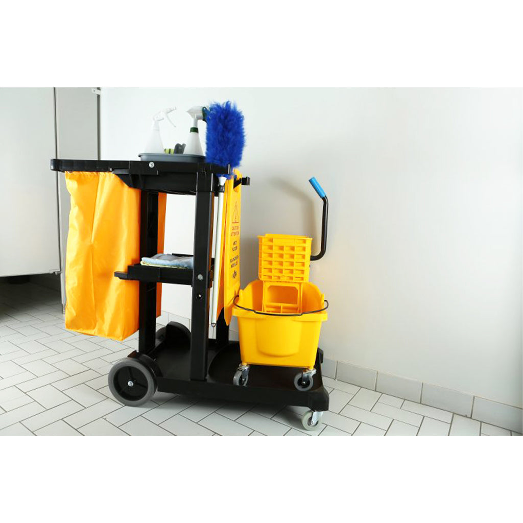 The janitor's cart is the ultimate mobile system for collecting waste, transporting cleaning tools while keeping everything organized with convenient shelving and hooks. The carts provides enough space to store janitorial supplies with features like multiple hooks to hold brooms/ handbags, dustpans and floor signs.