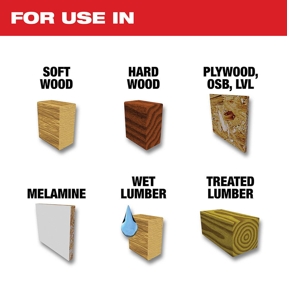- Great for use with: softwoods, hardwoods, melamine, wet lumber, treated lumber and laminated woods such as plywood, OSB, LVL, PSL, LSL & OSL