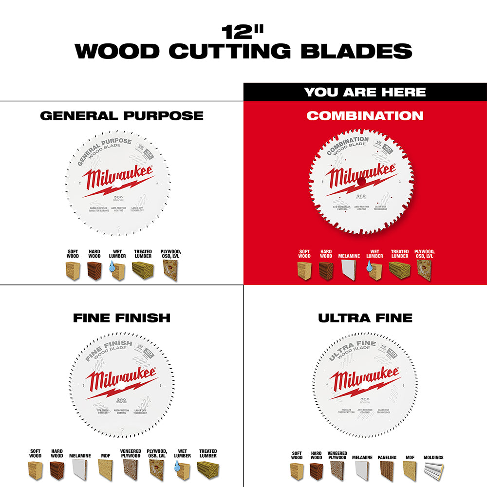 Milwaukee's wood cutting, combination blades provide cleaner cross cuts and faster ripping to improve your productivity. An aggressive ATB-R tooth pattern minimizes tear out in the cut material while increasing the speed of cut. An anti-friction coating keeps the blade cool while cutting and resists corrosion & gumming. Laser cutting technology creates the blade from 100% sheet steel to ensure a stable blade that increases cutting accuracy. 12 in. blades are ring tensioned to further stabilize the blade. Laser cut vibration slots minimize wobble and warping during use. A thin Kerf design delivers faster cuts as well as more cuts per charge when using a cordless tool.