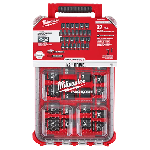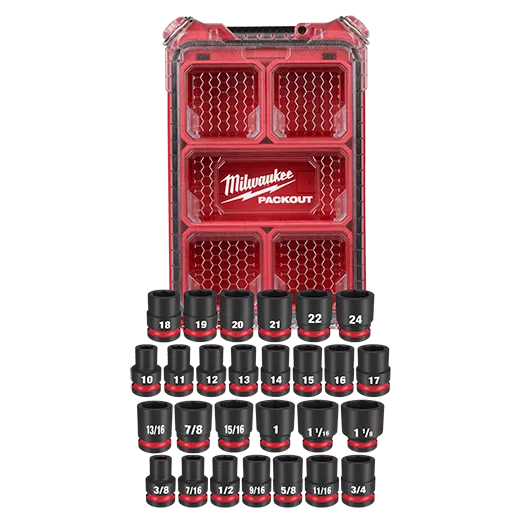 The SHOCKWAVE Impact Duty™ Socket Set features the boldest, longest-lasting markings and extreme impact durability in high torque applications. The stamped and ink-filled size marking enables you to select the right socket every time throughout the life of the socket. Engineered with high-strength forged steel for optimized performance in heavy-duty applications. The non-slip hex geometry prevents fastener rounding. Our dual-hole design and ring groove allow for easy socket attachment and removal. Sets can be kept organized in the included PACKOUT™ Compact Organizer with a clear top for easy identification of parts at a glance. The Compact Organizer is part of our PACKOUT Modular Storage System, allowing for customization of storage systems to easily transport and organize tools and accessories. All SHOCKWAVE Impact Duty ™ Sockets and Extensions are backed by our Lifetime Guarantee and meet ASME industry standards.