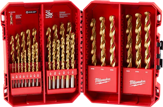 The MILWAUKEE® THUNDERBOLT® 29PC Titanium Drill Bit Set offers heavy-duty performance on the jobsite. Titanium coating reduces heat build-up and keeps the bit sharper providing up to 3X longer life. The thicker core provides ultimate strength and protects against side-load breakage while a specially designed parabolic flute form clears chips and debris fast to keep the bit cool. The 135° split point tip delivers a precision start and prevents walking for fast, accurate holes. MILWAUKEE® THUNDERBOLT® Titanium Coated bits are ideal for various drilling applications in wood, plastics, and metals. The set is organized in a customizable accessory case designed for use in PACKOUT™.