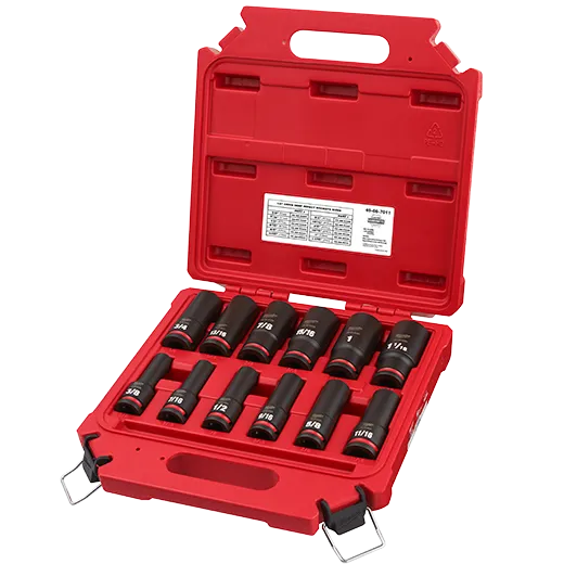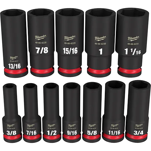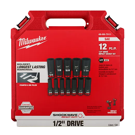 Milwaukee's SHOCKWAVE™ Impact Duty™ 1/2" Drive 6 Point Socket Sets feature the boldest, longest-lasting markings and extreme impact durability in high torque applications. The stamped and ink-filled size marking enables you to select the right socket every time throughout the life of the socket. These sockets are engineered with high strength forged steel for optimized performance in heavy-duty applications. The non-slip hex geometry prevents fastener rounding, and a dual-hole design and ring groove allow for easy socket attachment and removal. The storage cases are impact resistant and nest together for easy stacking and storage. All MILWAUKEE® SHOCKWAVE Impact Duty™ Sockets backed by a Lifetime Guarantee and meet ASME industry standards.