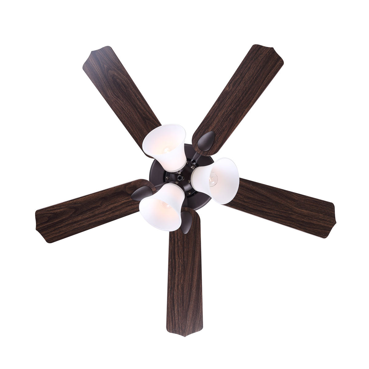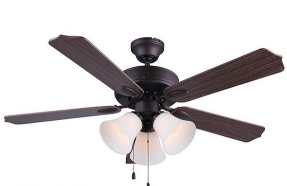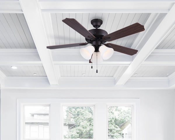 Enhance your living space with the 42-inch Rue ceiling fan. Featuring a rubbed antique bronze finish and flat opal glass shades, the Rue will add a classic design element to your home. Five reversible blades can easily be switched from walnut to medium oak finish to suit any Décor.