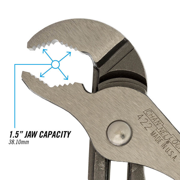 CHANNELLOCK® 422 9.5" Tongue & Groove Pliers have a unique v-jaw design that creates more points of contact on round stock and tubing. These pliers are built to last with a PERMALOCK® fastener to eliminate nut and bolt failure, patented reinforcing edge to minimize stress breakage and laser-hardened teeth to provide a better, longer lasting grip. CHANNELLOCK® V-Jaw Pliers are made in USA and forged from high carbon U.S. steel that is specially coated for ultimate rust prevention.