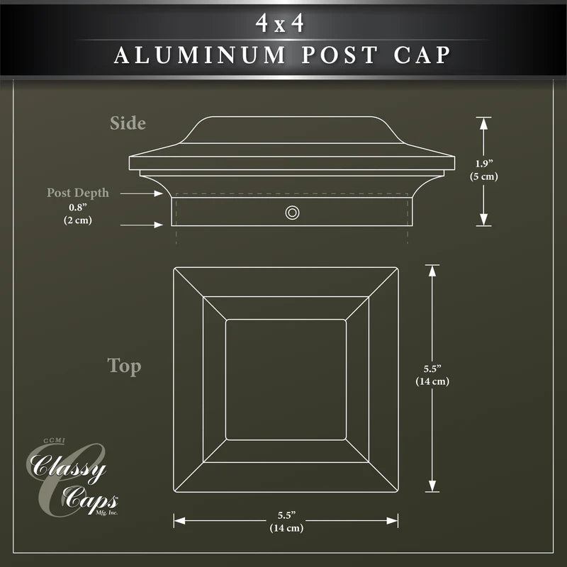 Crafted from heavy-duty cast aluminum, this versatile post cap is designed to fit three standard post sizes: 4"x4", 3.5"x3.5", and 3.25"x3.25". Its robust construction ensures long-lasting performance, while the sleek, modern design adds a touch of sophistication. Perfect for enhancing the appearance of your fence, deck, or posts, the Classy Caps 4x4 Aluminum Post Cap not only protects your posts from weathering and decay but also elevates your exterior decor. Easy to install and maintenance-free, this post cap is the ideal finishing touch for any project.