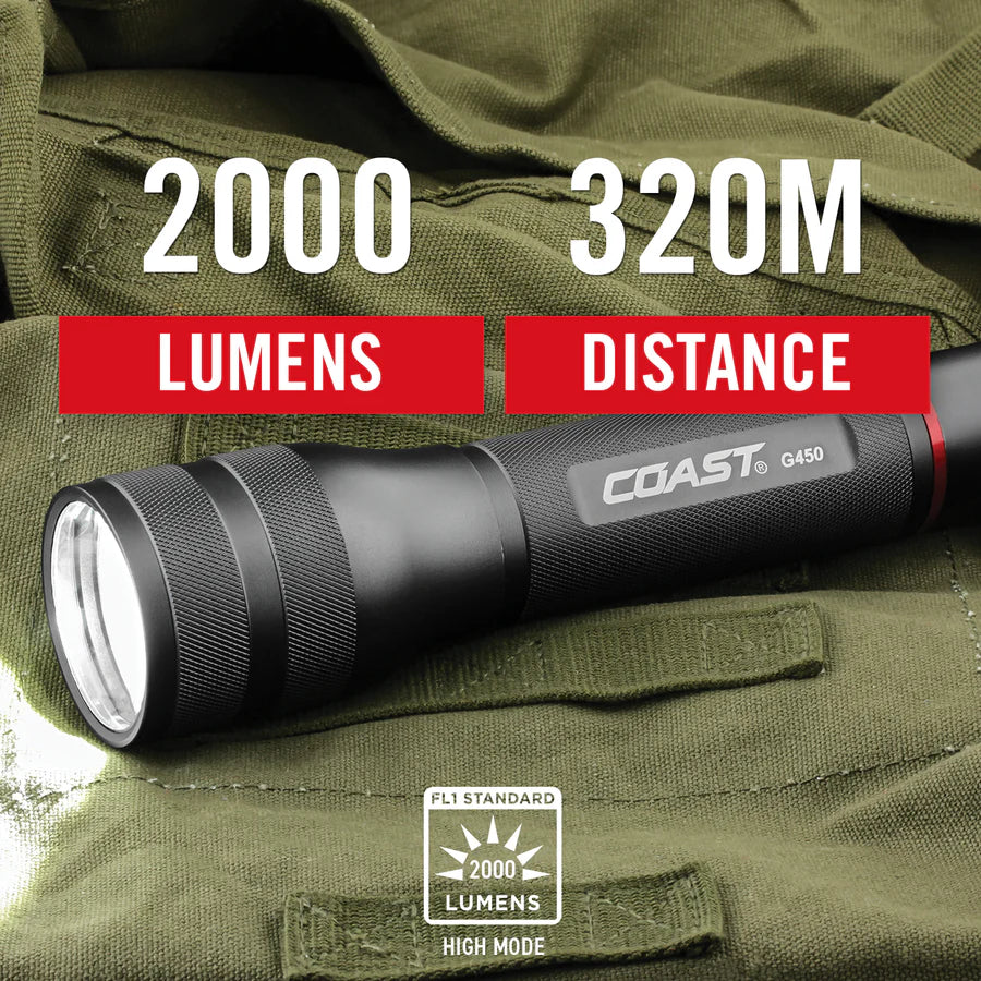 Flashlight - COAST G450 Black 2000 Lumens Pure Beam Focusing 6AA Flashlight, Black, 30609