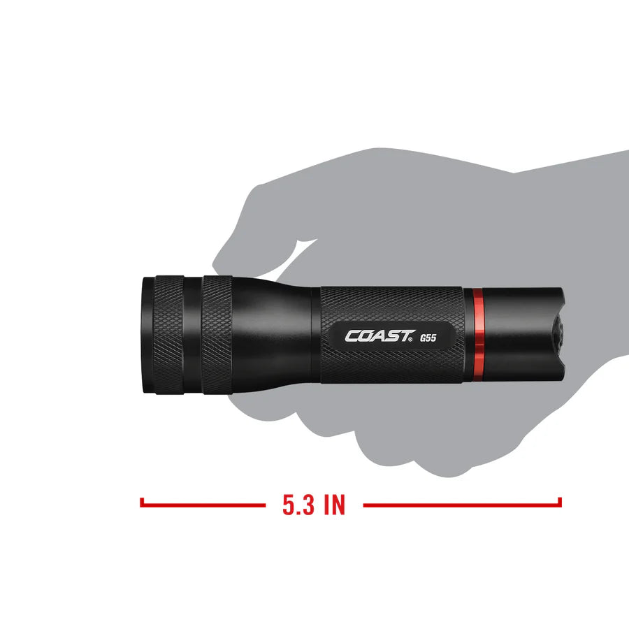 Go light, go bright. The G55 flashlight downsizes our classic frame to match performance with portability—delivering 750 lumens on high with a beam distance of 201 meters (659 feet). A pocket-perfect handle and easy-click tail switch combine with COAST-patented PURE BEAM® optical technology and TWIST FOCUS™ to create a lightweight, ergonomic standout with seamless transitions between Ultra View Flood Beam and BULLS-EYE™ Spot Beam. This three-mode multi-purpose workhorse shines for 21 hours on a single set of batteries. Constructed of top-grade aluminum, the G55 flashlight is IP54 storm proof and dust resistant—to keep you ready in every moment.
