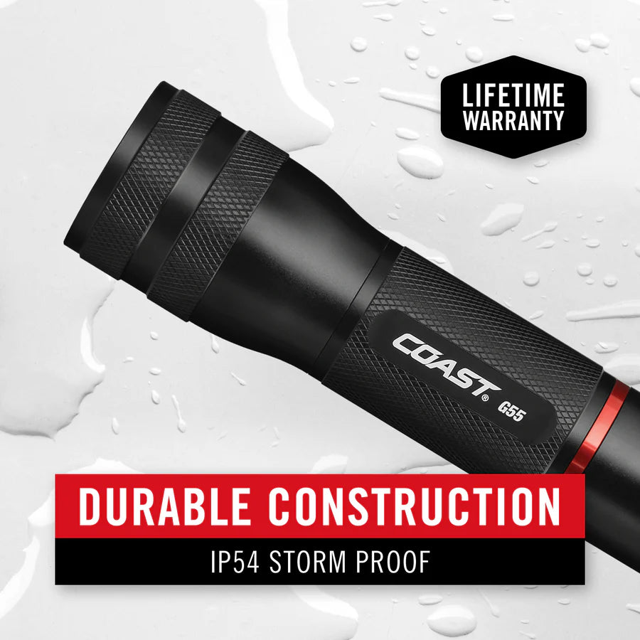 With Coast’s commitment to quality, the G55 Flashlight is impact resistant, weather resistant and its LED is virtually unbreakable. The G55 Flashlight is backed by Coast’s lifetime warranty against defects in materials and workmanship. Tested and rated to ANSI/FL1 standards.