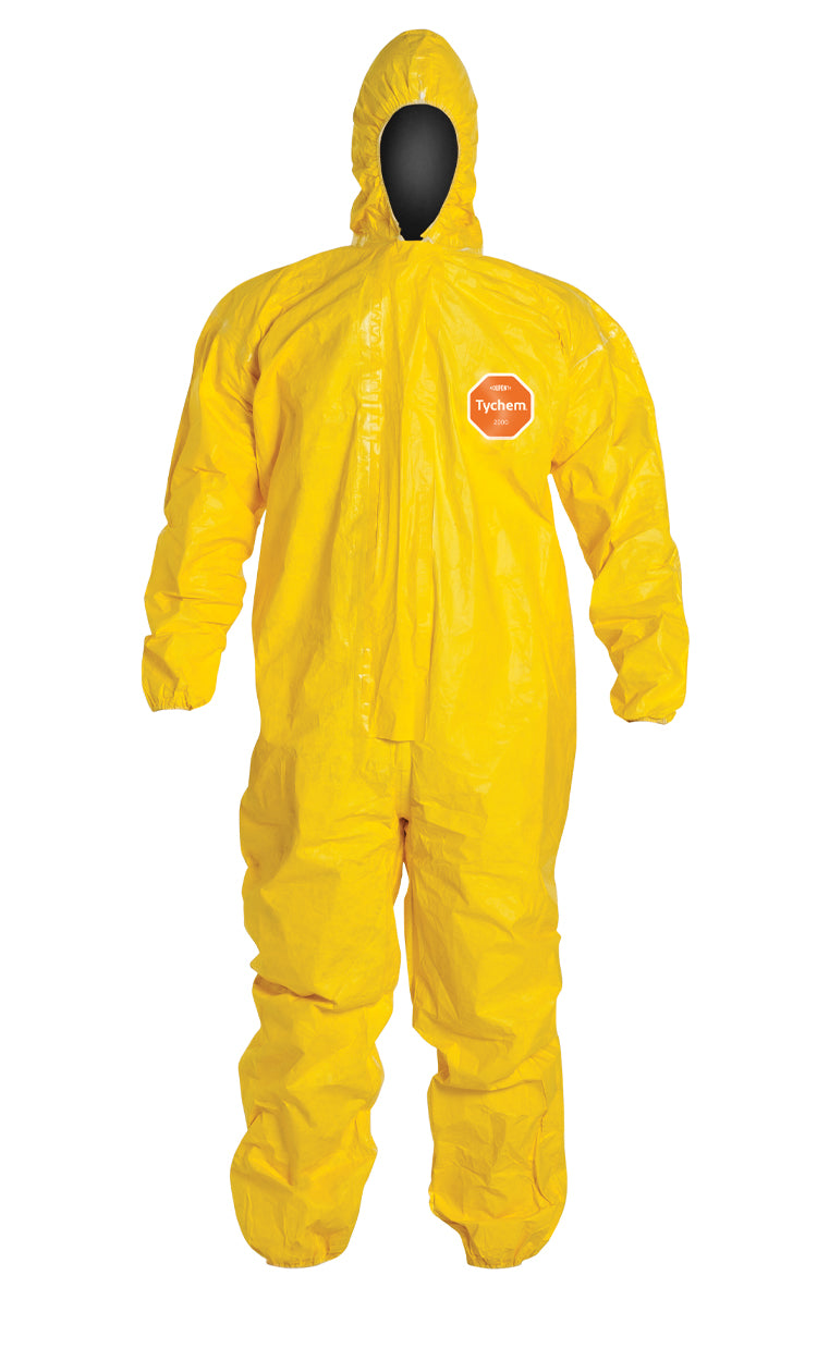 Coveralls - DuPont Tychem® 2000 Standard Fit Hood, Stormflap, Elastic Wrists & Ankles, Storm Flap w/ Adhesive Closure, Taped Seams, Yellow (Case of 4) QC127T - M is currently out of stock.