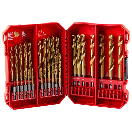 The MILWAUKEE® SHOCKWAVE Impact Duty™ 29PC RED HELIX™ Titanium Drill Bit Set is engineered for extreme durability and long life. The QUAD EDGE™ tip delivers a precision start and features four cutting edges to create smaller chips for faster material removal and less heat leading to improved performance. Designed with a VARIABLE HELIX™ flute that begins with an aggressive 35° helical angle and ends at 15° for rapid chip removal. The bits also feature an internal thicker tapered web that greatly increases strength, reducing premature breakage. Ideal for various applications including but not limited to wood, plastics, and metals. MILWAUKEE® RED HELIX™ Titanium Drill Bits provide up to 5X life vs. black oxide drill bits. Set is organized in a customizable accessory case designed for use in PACKOUT™.