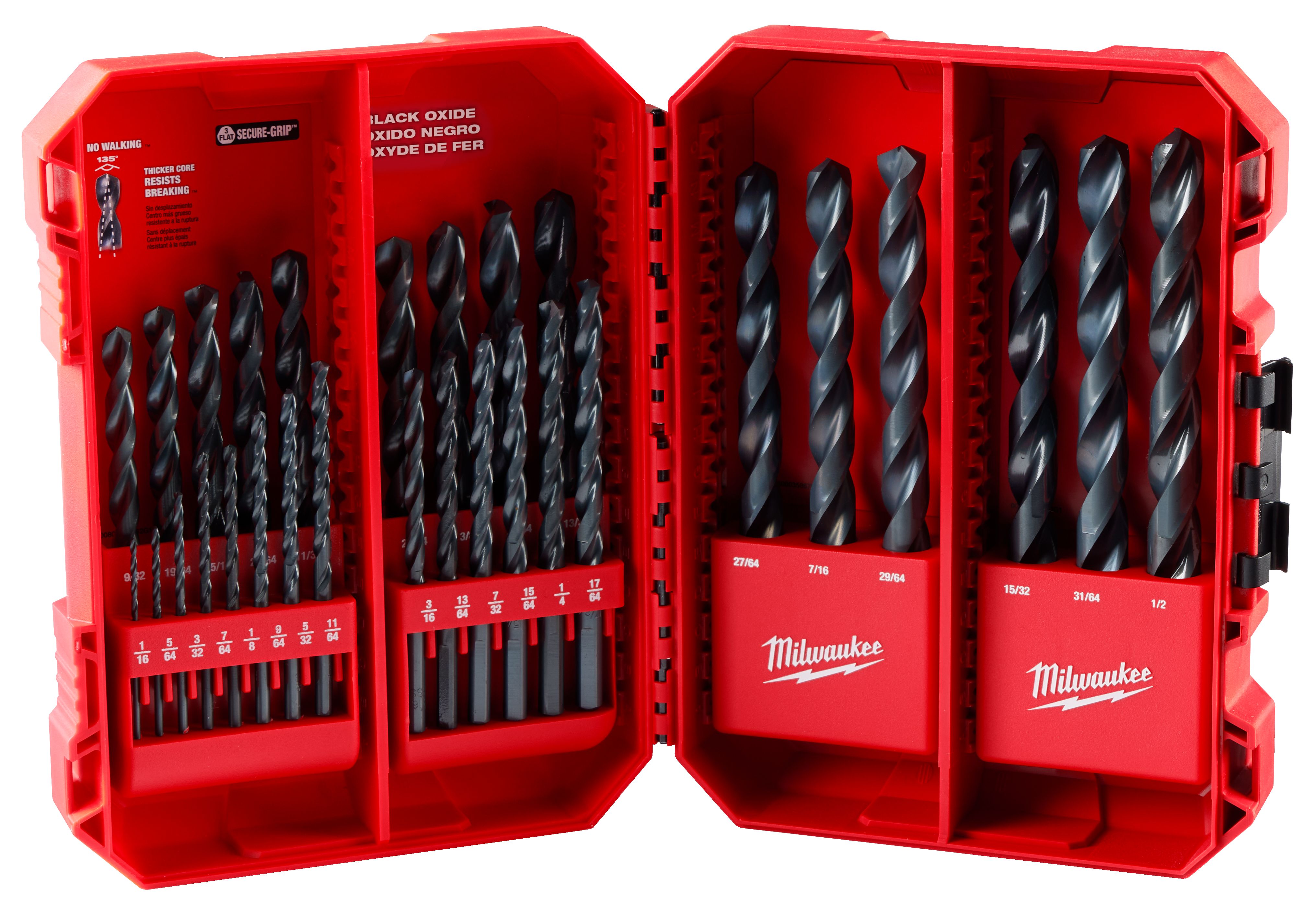 MILWAUKEE® THUNDERBOLT® 29PC Black Oxide Drill Bit Set offers heavy-duty performance on the jobsite. Black Oxide coating reduces heat build-up and provides corrosion resistance. The thicker core provides ultimate strength and protects against side-load breakage while a specially designed parabolic flute form clears chips and debris fast to keep the bit cool. The 135° split point tip delivers a precision start and prevents walking for fast, accurate holes. MILWAUKEE® THUNDERBOLT® Black Oxide Coated bits are ideal for various drilling applications in wood, plastics, and metals. The set is organized in a customizable accessory case designed for use in PACKOUT™.