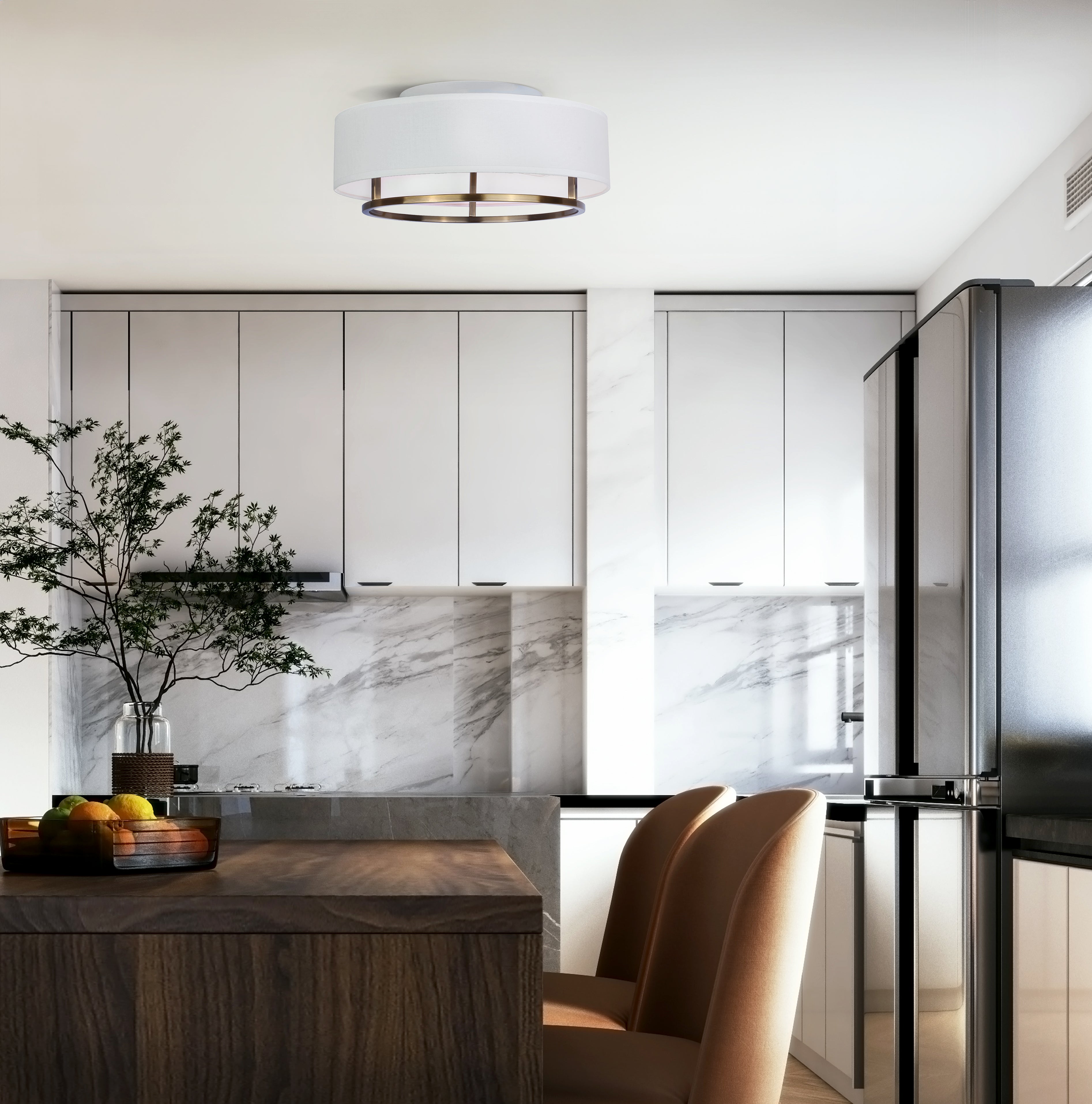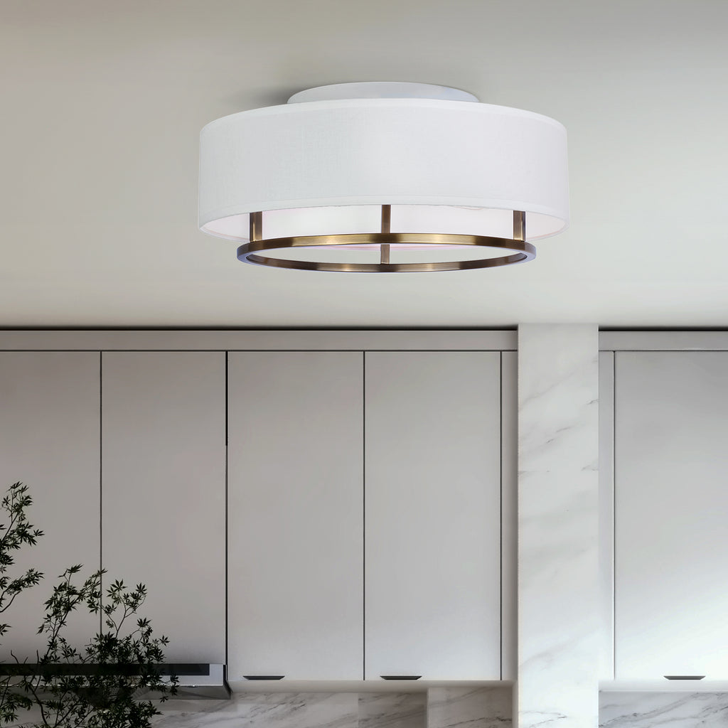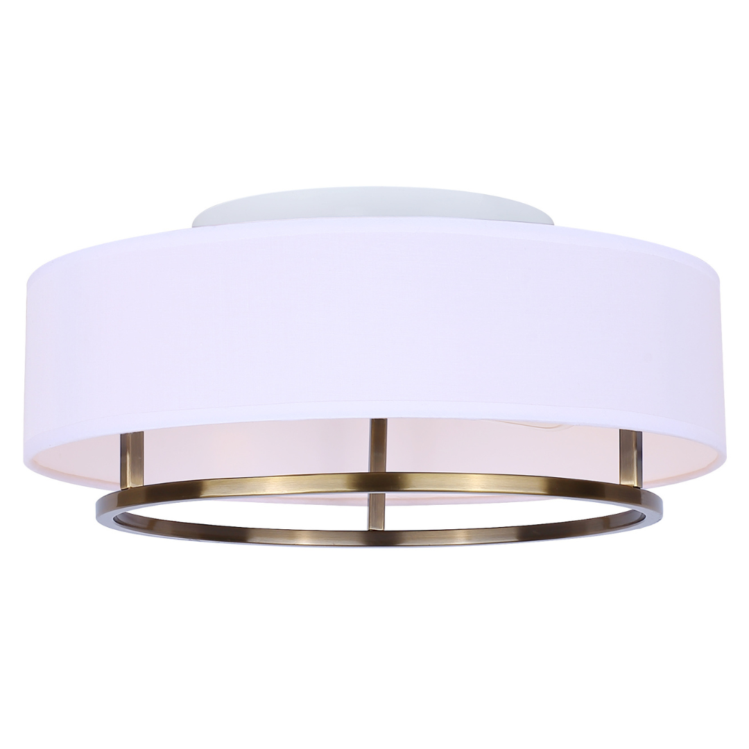 The Bonnie flush-mount radiates timeless modern elegance with its smooth, simple shapes and gold frame, complemented by a crisp white fabric drum shade. It provides a comfortable down glow that highlights contrasting linear accents at the base, while the open shade ensures optimal light output. Perfect for dining rooms, bedrooms, or living spaces, Bonnie adds a touch of mid-century modern sophistication to any on-trend decor.