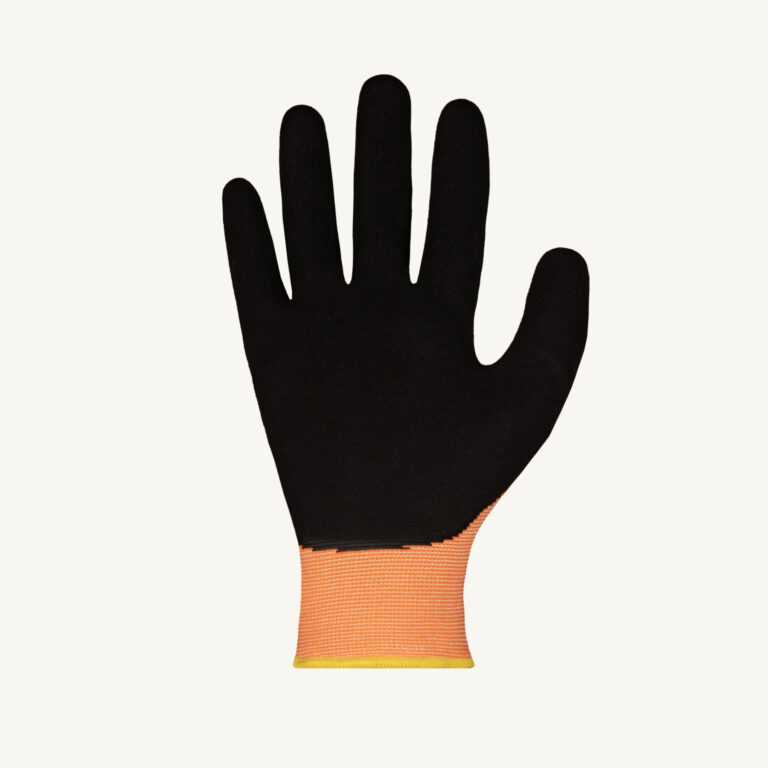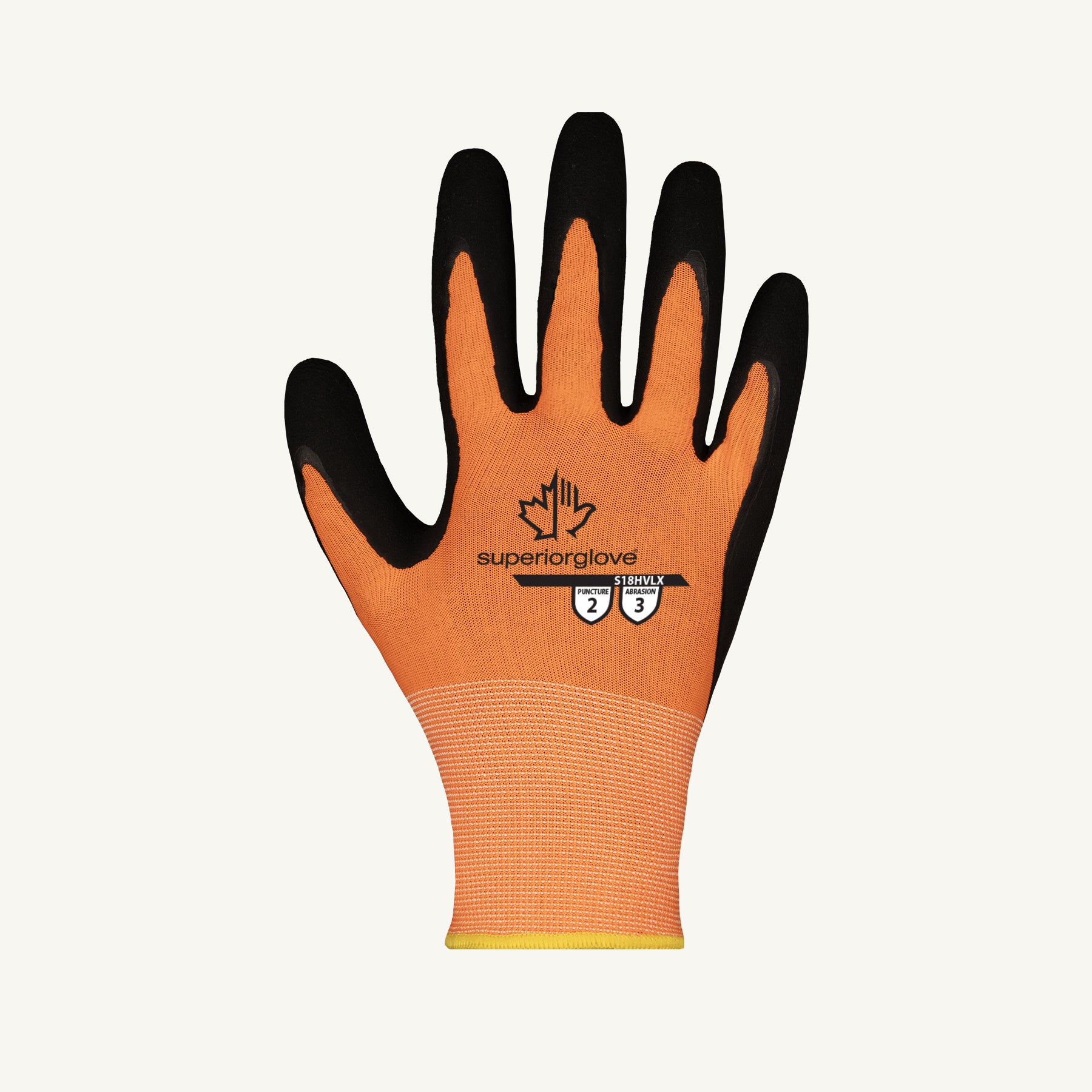 The Dexterity® S18HVLX hi-viz gloves feature a crinkle latex palm coating for a steady grip on wet and dry surfaces. Made with sweat-wicking polyester knit, their ergonomic shape offers a snug fit, making them ideal for comfortable all-day wear. A hi-viz orange shell provides better visibility for hand placement.