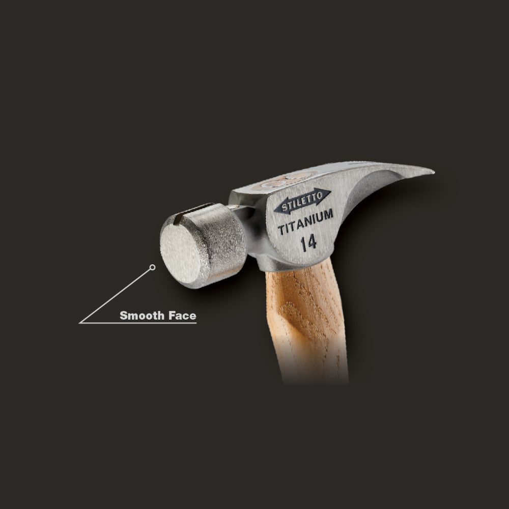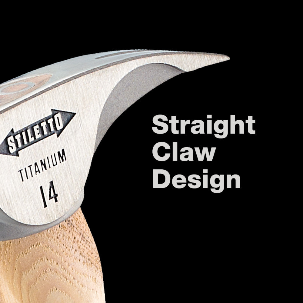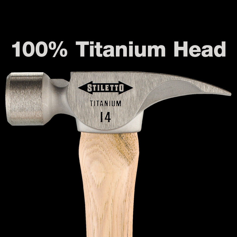 The Stiletto TI14SS is a 14 oz titanium smooth face framing hammer with an 18 in. straight hickory handle. The hammer has a straight claw design and Stiletto's signature magnetic nail starter. The TI14SS has the comparable striking force of 24 oz steel hammer and is recommended for residential framing and remodeling. Stiletto Tool company has been synonymous with high quality hand tools dating back to 1849. With our long history and strong reputation, the brand has evolved into the modern day standard for innovative, lightweight, ergonomic, productive, and professional tools. We set the standard with our line of premium titanium hand tools that span numerous trades such as framing, remodeling, finish work, siding, demolition, concrete, and drywall. Titanium is 45% lighter weight while providing the same striking force and strength as steel. Titanium tools also produce 10 times less recoil shock which helps reduce carpal tunnel syndrome. The combination of these features means less down time, more productivity, and most importantly less pain while working.