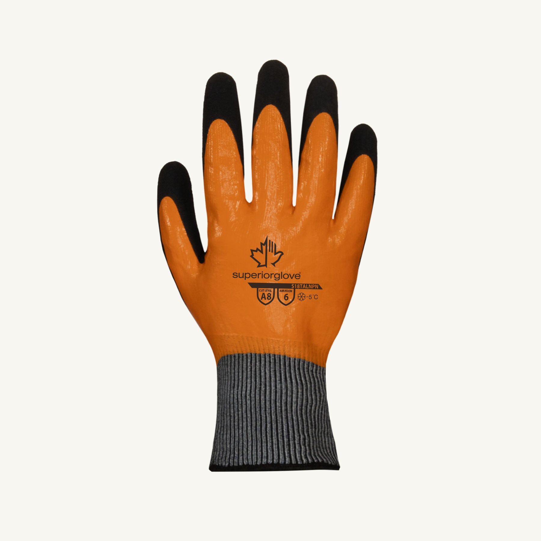 Superior Glove's cold-rated Dexterity® S18TALNPN gloves offer extreme cut protection with double-dipped hand coating for liquid resistance, warmth, and long wear life. Made with TenActiv™ engineered yarn, they provide 360° cut protection with ANSI A8 cut resistance while the acrylic fleece lining keeps hands warm in temperatures down to -5°C / 23°F. Nitrile hand coating prevents liquid penetration and palms are double-dipped with micropore nitrile for steady wet grip and better durability.