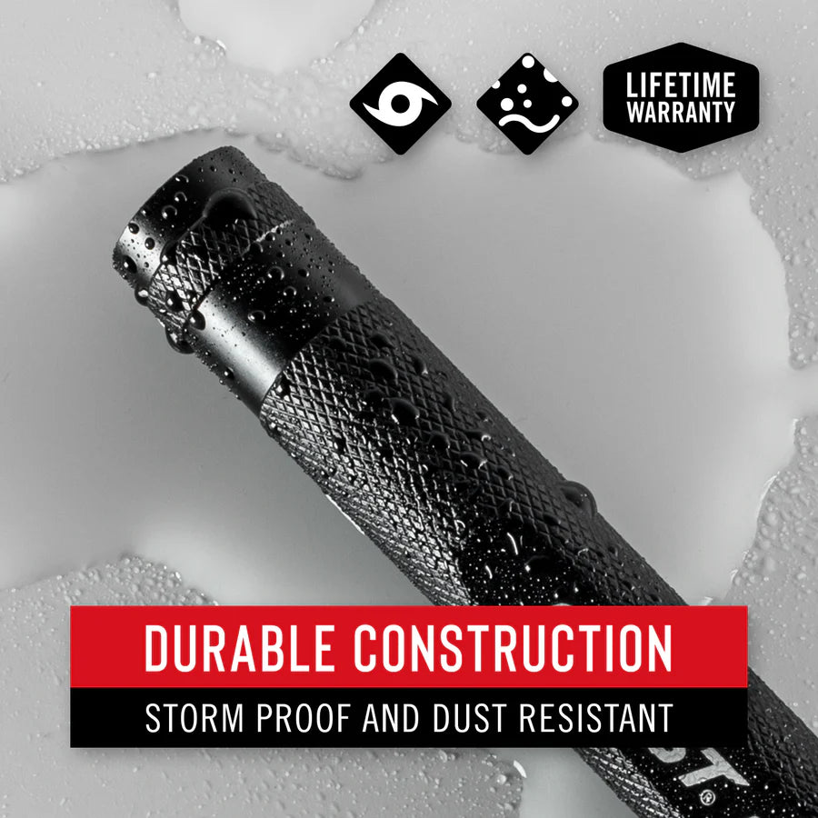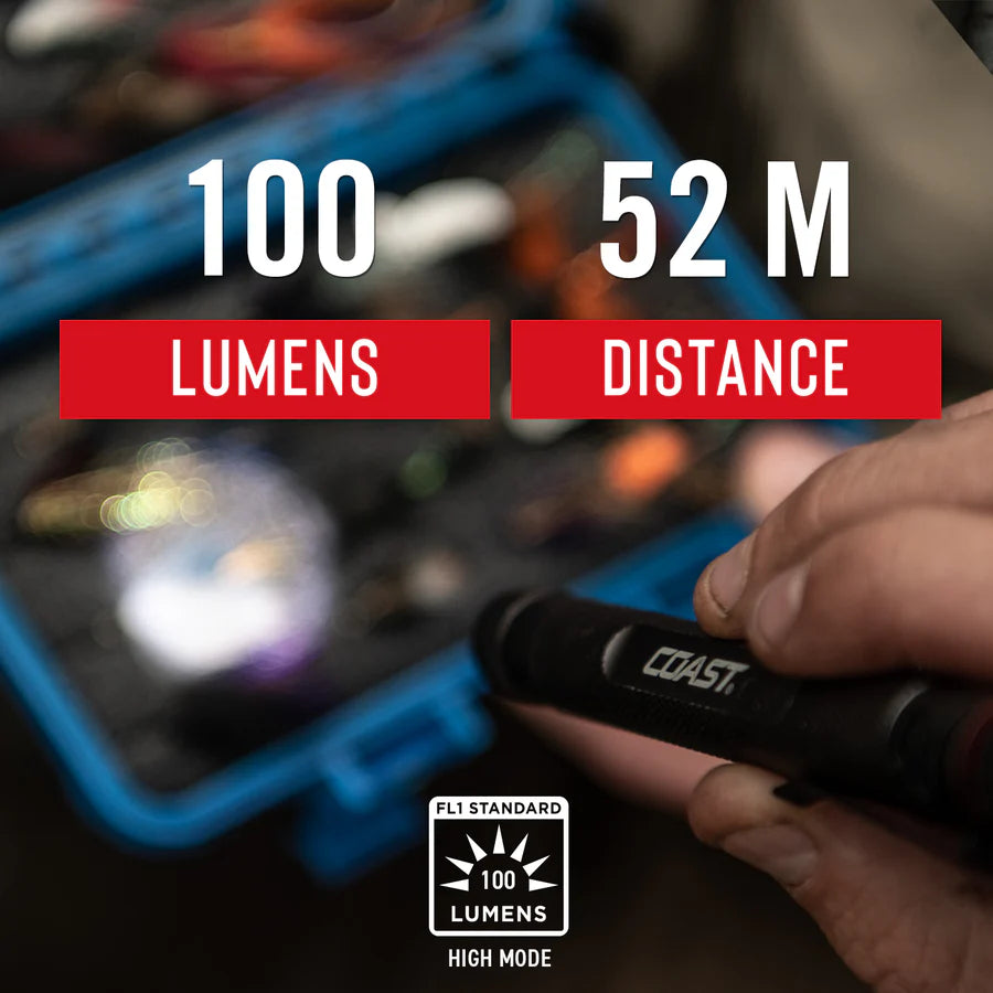 Carry close, see far. The G22 flashlight, unique among COAST pen lights, features a fixed BULLS-EYE™ Spot Beam and pocket clip to combine clip-and-carry convenience with longer-range viewing. Maxing out at 100 lumens, the two-mode beam from this sleek frame reaches 55 meters (180 feet) with a hotspot at the center and a surrounding halo of softer light to expand the viewing area. The G22 measures 4 inches long and less than one ounce—combining ultimate portability with ultra-durable construction. Made from top-grade aluminum, this go-everywhere pen light is IP54 storm proof and dust resistant, ready to shine in any weather.