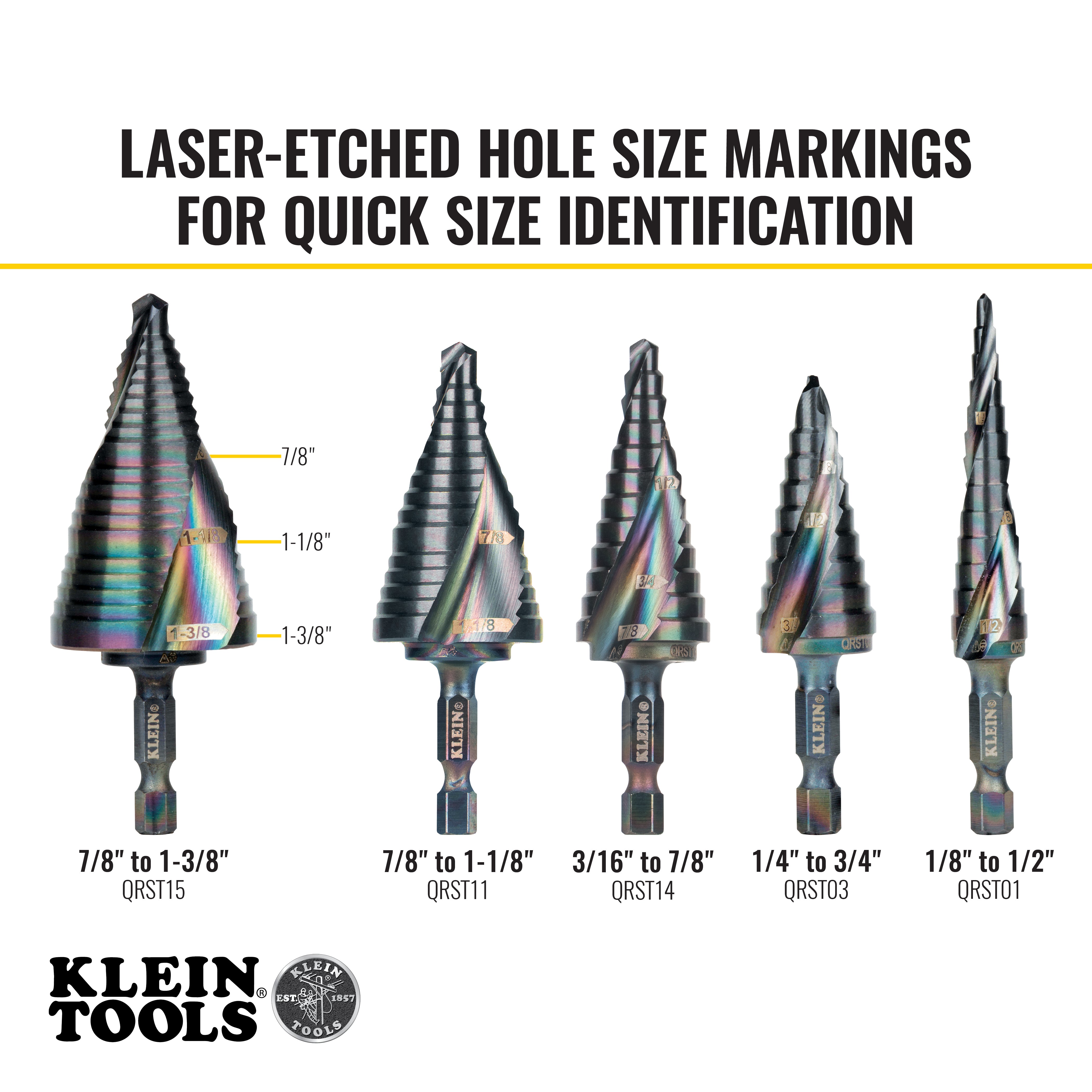 Step Drill Bit - Klein Tools Step Drill Bit, Quick Release, Spiral Flute, 7/8 to 1-3/8-Inch, QRST15 is currently out of stock.
