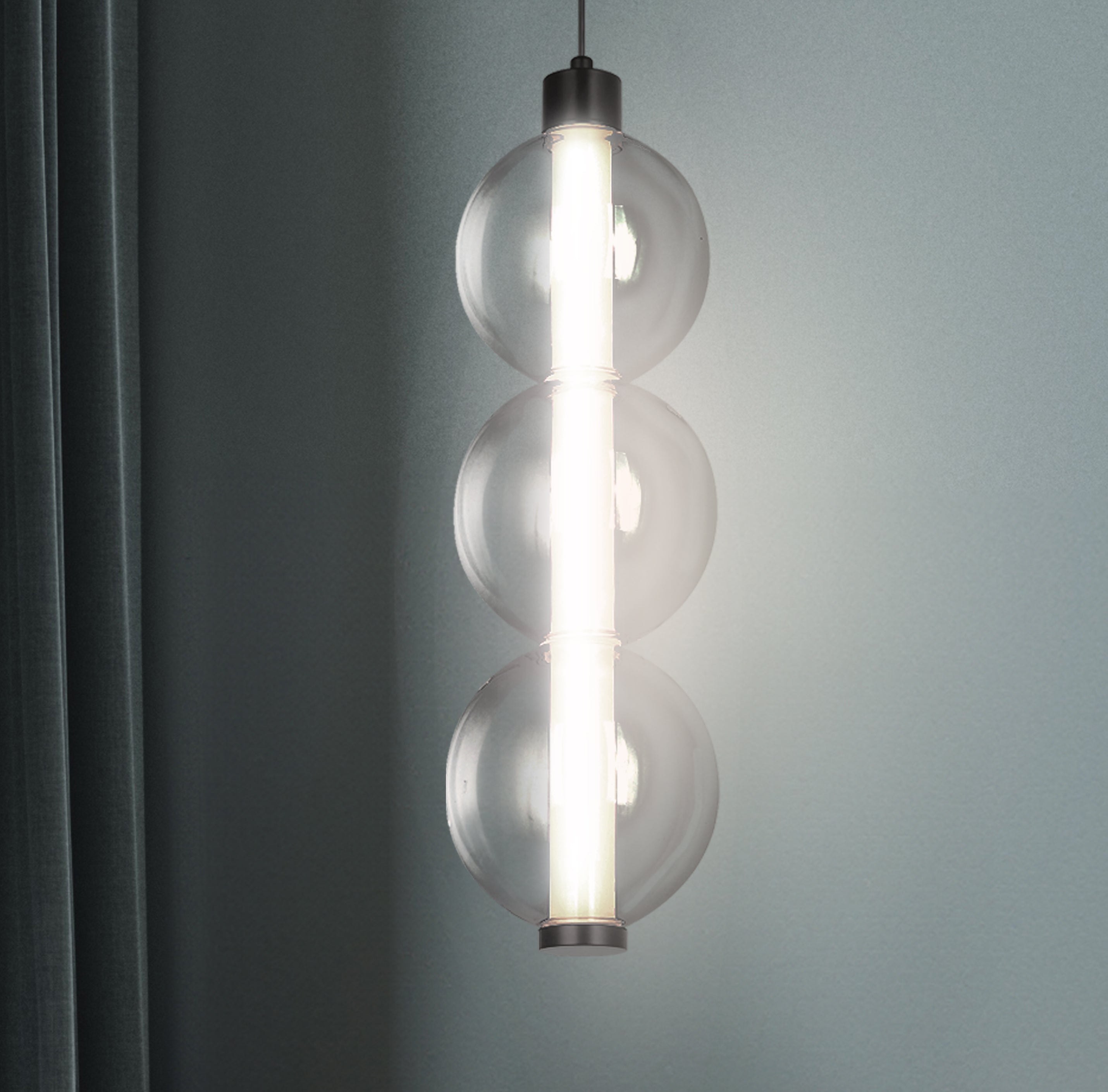 The Melody pendant features a unique contemporary design with three globes, each perfectly aligned around a central LED bar. This arrangement creates a visually striking effect while ensuring that every inch of the room is evenly illuminated. When lit, Melody casts a bright, inviting glow that enhances any space with its modern elegance and eye-catching style.