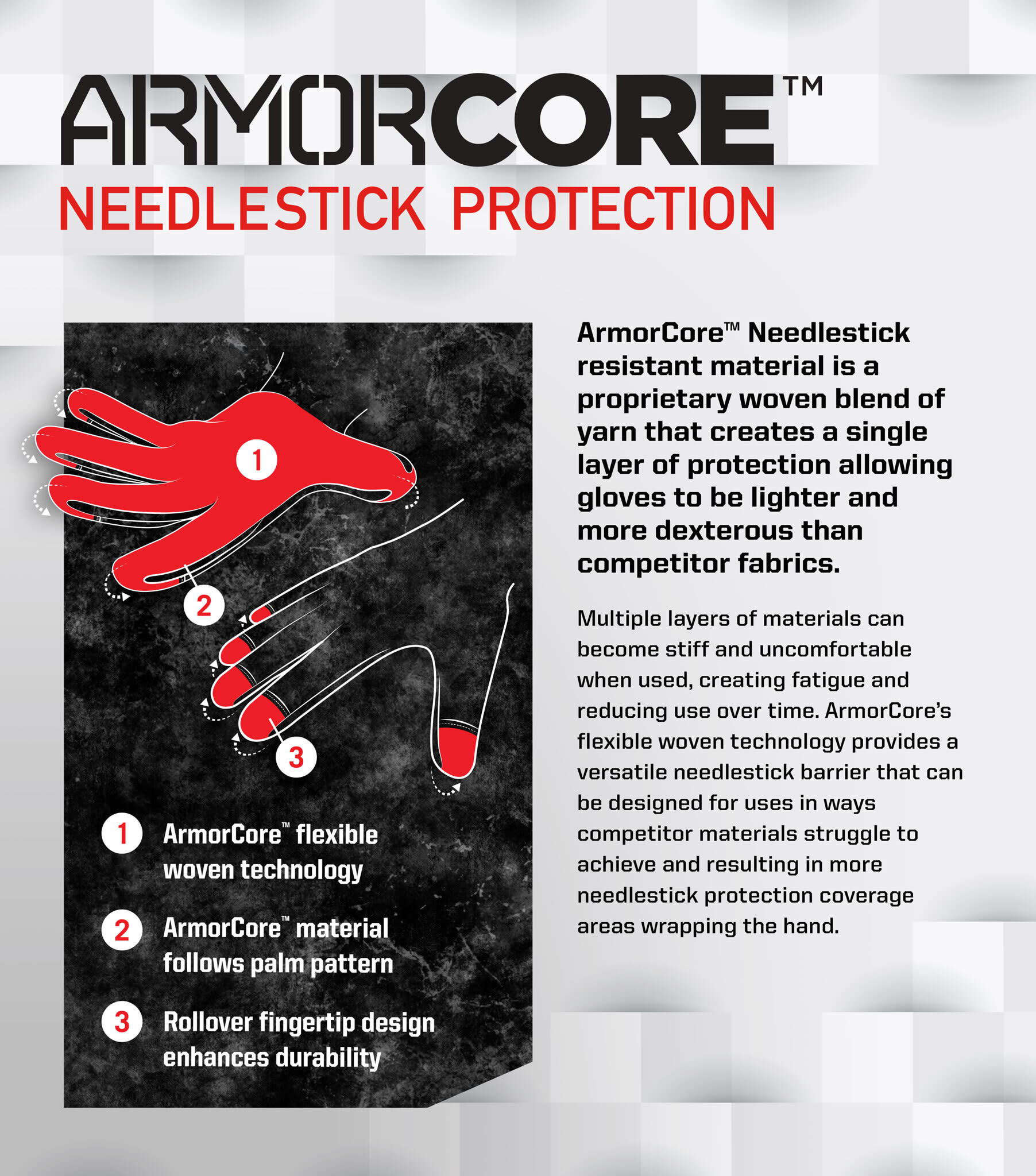 - ArmorCore™ technology across the entire palm, sides of fingers and rolling over fingertips, allows for ASTM F2878 level 2 needlestick puncture protection and A5 cut protection.