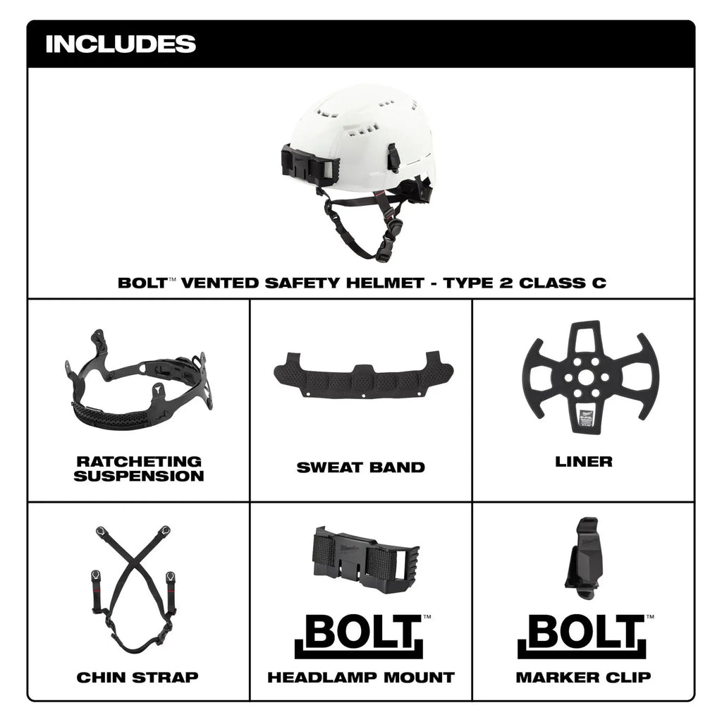 Milwaukee's Type 2 Safety Helmets deliver you better protection and more comfort. These safety helmets offer protection from top and side impacts. These construction safety helmets are BOLT™ compatible with four BOLT™ accessory slots and two universal accessory slots that easily integrate additional personal protection equipment and accessories so you can adapt to your jobsite. The helmets include a MILWAUKEE® BOLT™ Headlamp Mount that works with most headlamps for easy, secure attachment, and a BOLT™ Marker Clip allows for easy access to pens and markers. This Milwaukee helmet has a comfortable padded suspension that includes an adjustable swinging ratchet for better comfort. The climbing style helmet also has a comfortably fitting five adjustable buckle chin strap for better security. An antimicrobial sweatband and helmet liner prevent odor and bacteria build up and are removable and machine washable. These safety helmets are ANSI type 2 and customizable by adding your logo.