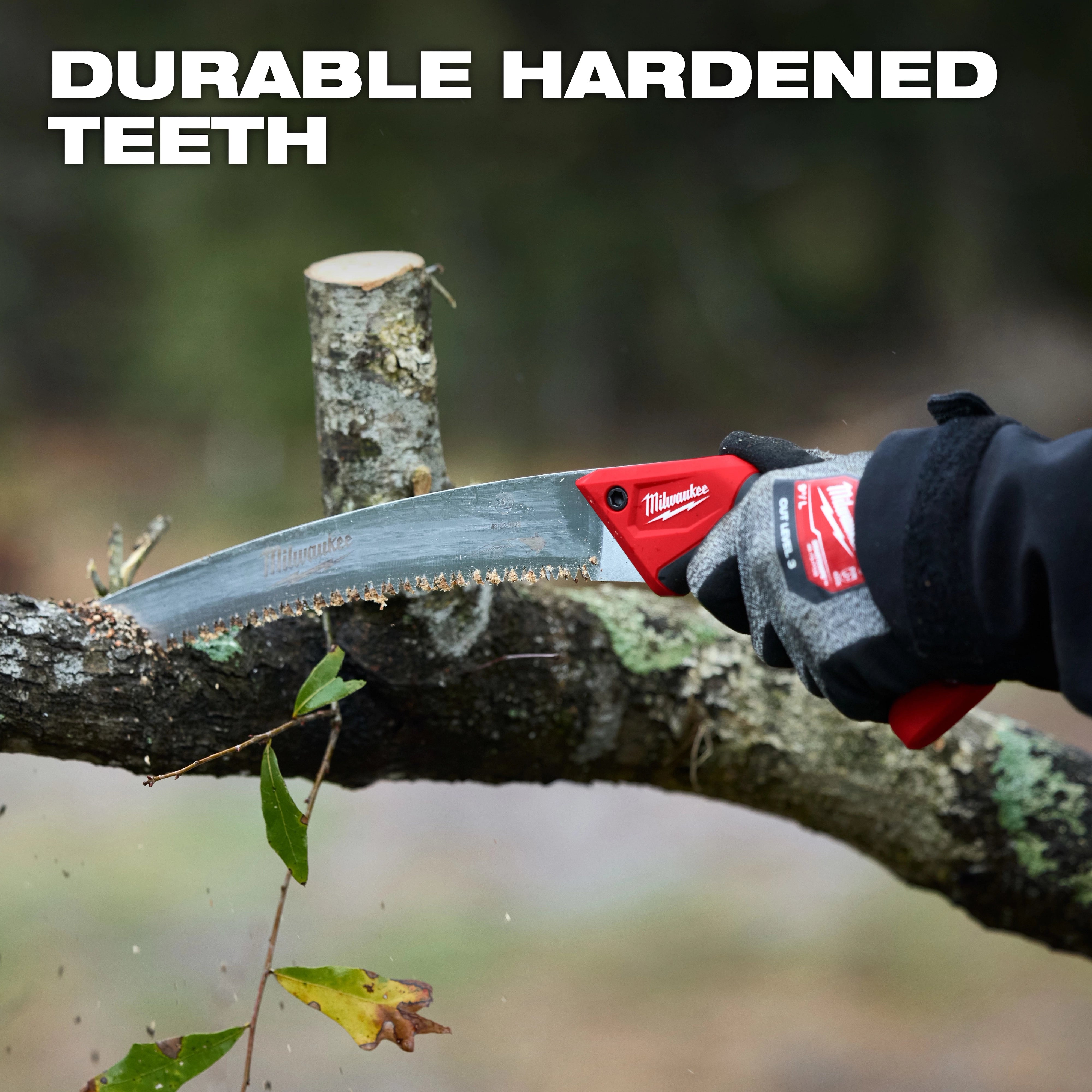 The MILWAUKEE® 14" Fixed Pruning Saw delivers the Fastest, Cleanest Cutting. The Saw's ultra-sharp teeth provide effortless, precise cutting on branches up to 8". The durable, hardened teeth stay sharper for longer. The Saw includes a reversible scabbard that can be carried on either side of the body. Quadruple ground teeth and a curved chrome-plated blade improve cutting performance for increased productivity on the job. The 14" Fixed Pruning Saw is covered by a limited lifetime warranty.