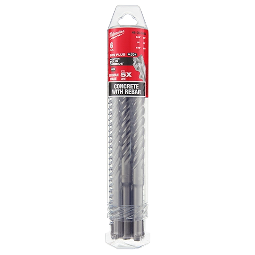 MX4™ 4-Cutter SDS PLUS Rotary Hammer Drill Bits with solid head carbide deliver up to 5x longer life in concrete with rebar. Engineered with rebar guards to provide maximum durability in hard aggregate and rebar. They designed MX4™ 4-Cutter bits with sharp centering tips for exact spot drilling in concrete and metal decking. 4-cutter design prevents lock-up in rebar, reducing downtime. Variable flutes remove dust faster, reducing heat and delivering up to 20% more holes per battery charge. The wear mark indicator on each drill bit shows you when they no longer meet the ANSI requirement. These MILWAUKEE® MX4™ 4-Cutter Drill Bits are ideal for concrete with rebar and masonry applications. Choose from single bits, bulk packs, or drill bit kits in a variety of sizes.