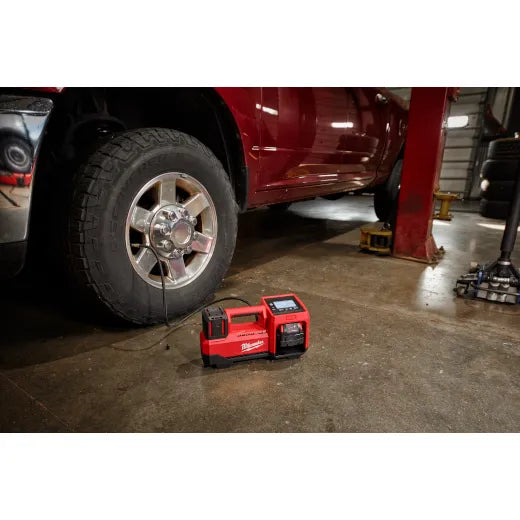 Our FASTEST 18V CORDLESS TIRE INFLATOR. The M18™ Inflator delivers fast, accurate, easy inflation with the portability to take anywhere. Optimized for passenger, light truck, and other medium-duty tires. Rated to deliver max 150PSI, the high efficiency motor tops-off 33” light truck tires in under 1 minute. The TrueFill™ Technology features an auto-pressure check that is designed to WAIT for the pressure to stabilize, CHECK the system pressure, and FILL until the desired target is reached. In addition, an Auto Shut-Off feature will stop inflation at selected PSI to prevent overinflation allowing users to set it & forget it. Furthermore, the unit includes 4 PSI memory slots, anti-vibration feet, a 36” inch hose with an all-brass Schrader chuck, and an on-board hose and nozzle storage.