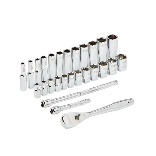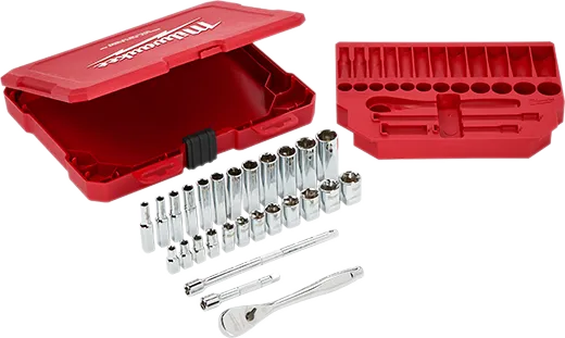 The MILWAUKEE® SAE 28 piece 1/4" drive Ratchet & Socket set is designed from the ground up, offering our users the Most Versatile Sockets that are Anti-Roll and Wrench-Ready. Its innovative FOUR FLAT™ Sides feature an anti-roll and wrench-ready design. The 90 tooth ratchet tool offers 4° of arc swing and a slim profile design, allowing you to work in tighter and more confined spaces, be it under the hood of a car or in the middle of a remodel. The ratchet and socket kit comes with a removable inner tray which is perfectly designed to be stored long-term in a steel storage chest. All of our sockets are stamped with metric measurements on the flat side for easy-to-read visibility. It also comes with a durable carrying case for ultimate portability. The set comes with accessories included so that our users can get every job done, both in the garage and on the jobsite. Our ratchet and socket set is backed by our Lifetime Guarantee.