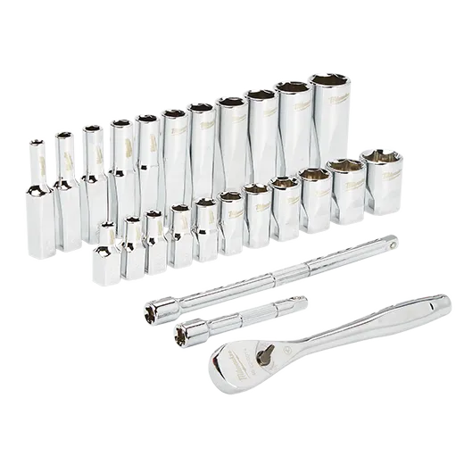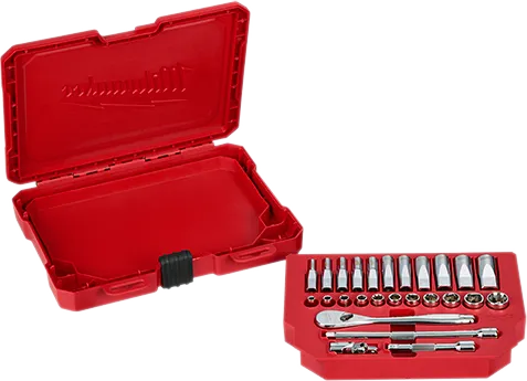 The MILWAUKEE® SAE 26 piece 1/4" drive Ratchet & Socket set is designed from the ground up, offering our users the Most Versatile Sockets that are Anti-Roll and Wrench-Ready. Its innovative FOUR FLAT™ Sides feature an anti-roll and wrench-ready design. The 90 tooth ratchet tool offers 4° of arc swing and a slim profile design, allowing you to work in tighter and more confined spaces, be it under the hood of a car or in the middle of a remodel. The ratchet and socket kit comes with a removable inner tray which is perfectly designed to be stored long-term in a steel storage chest. All of our sockets are stamped with SAE measurements on the flat side for easy-to-read visibility. It also comes with a durable carrying case for ultimate portability. The set comes with accessories included so that our users can get every job done, both in the garage and on the jobsite. Our ratchet and socket set is backed by our Lifetime Guarantee.