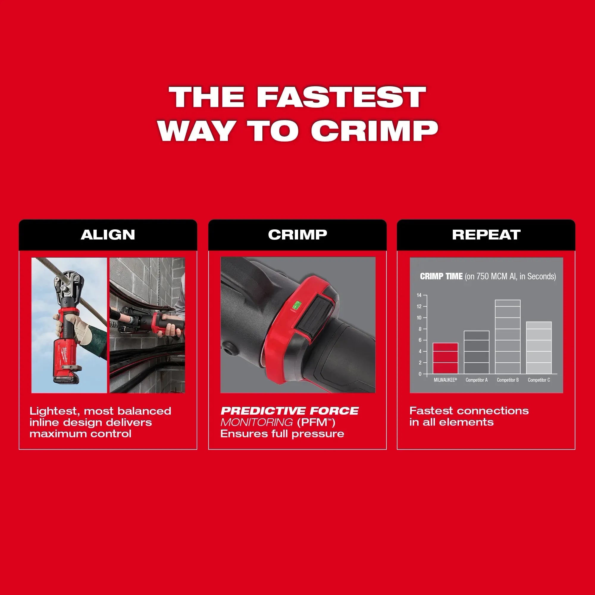 Milwaukee's M18™ FORCE LOGIC™ 12T Latched Linear Crimper is The Fastest Way To Crimp. Equipped with fully enclosed high-speed hydraulics, a POWERSTATE™ Brushless Motor, REDLINK™ Electronics, and REDLITHIUM™ Batteries, the crimp tool provides the fastest crimp speed and unmatched reliability in the toughest conditions. The linear crimper is designed to allow one-handed use in multiple orientations. An enlarged trigger and electronic release button enable both left and right-handed users to easily activate the tool while wearing Class 3 gloves. The head of the crimper rotates 340° and the quick release and push-to-close style latch pin can be easily opened or secured with just one touch. Predictive Force Monitoring (PFM™) constantly measures output force to deliver the fastest crimp speeds across all connector types and sizes and ensures full pressure is reached every time. A pre-crimp battery check confirms that the battery has enough charge to complete a full crimp. Full compatibility with all industry-standard U-dies allows you to use the dies already on your truck. Our crimper creates UL Classified crimps per UL 486A-B on #8 - 750 MCM Copper and Dual Rated Anderson, Blackburn®, Burndy, Ilsco, Panduit, Penn-Union, and Thomas & Betts color-coded lugs and splices when using our EXACT™ 12T U-Dies. Our crimper is integrated with our ONE KEY™ Technology, giving the crimper the ability to store real-time crimp data.