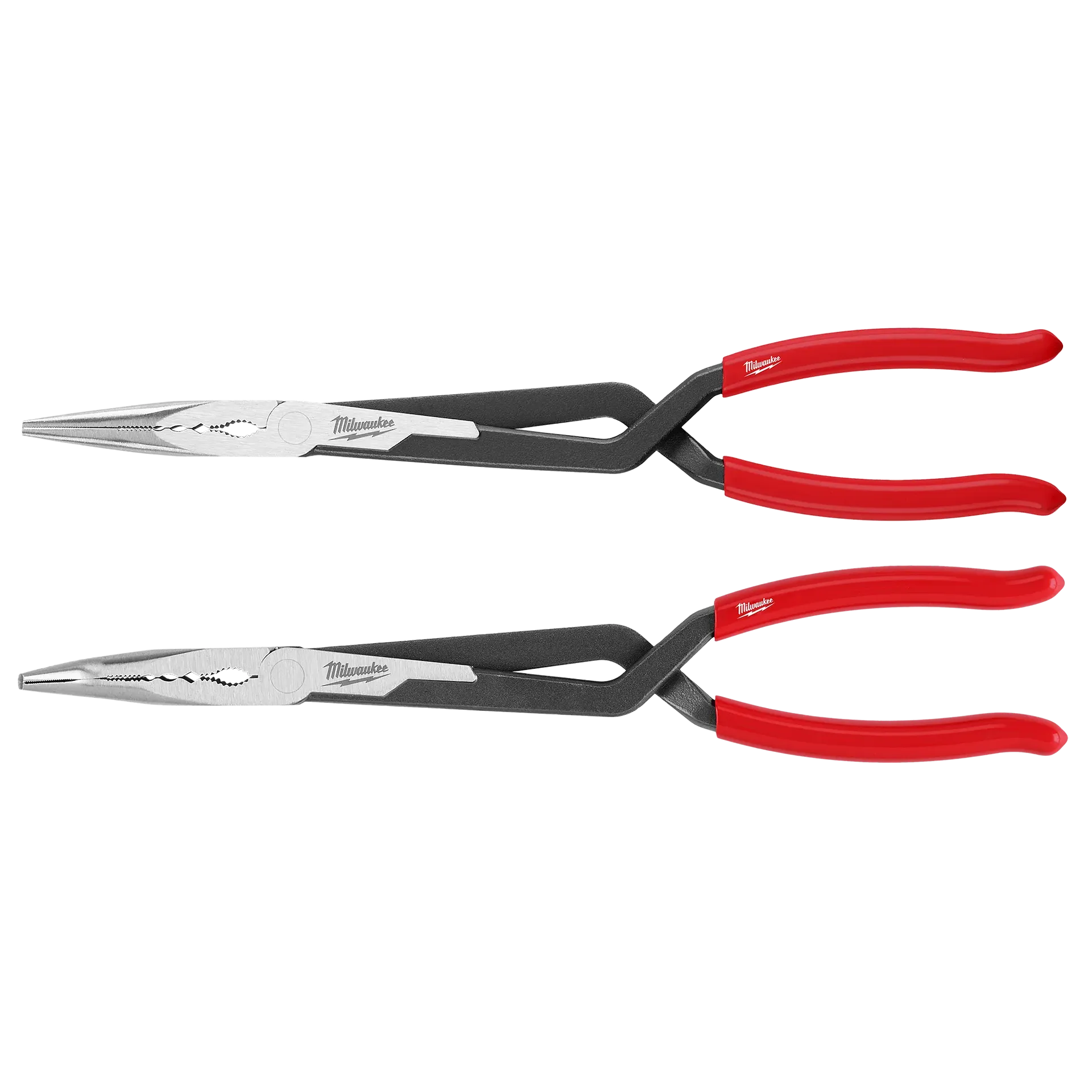 13” Long Reach Pliers Set provides the best access and maximum gripping force*. The MILWAUKEE® Long Reach Pliers set includes (1) Straight Nose Plier and (1) 45° nose plier. Both pliers feature a Deep-Reach Cross Handle design which delivers a wide jaw opening while maintaining a slim profile for extended reach in tight spaces. The single joint pliers provide maximum gripping force and allow for more control when handling different materials and objects. The jaws are designed with multi-function gripping zones for common applications such as fasteners, washers, wires, and more. The long-reach pliers feature a corrosion-resistant black oxide coating for increased durability and slip-resistant grips for better leverage. These pliers are backed by a limited lifetime warranty.