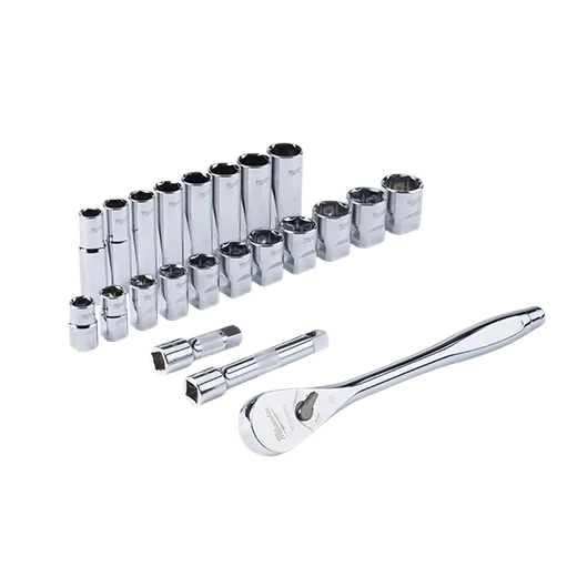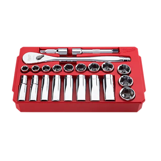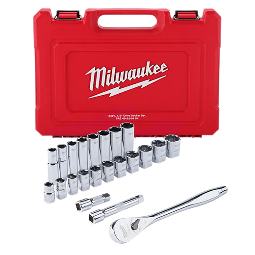 The 22-Piece SAE ½" Drive Ratchet & Socket Set is designed from the ground up, offering you the most versatile sockets on the market. The1/2” drive ratchet and socket set has innovative FOUR FLAT™ sides for an anti-roll and wrench-ready design. The 90-tooth ratchet tool delivers 4° of arc swing and a slim profile design, allowing you to work in tighter, more confined spaces. The MILWAUKEE® ratchet and socket set comes with a removable inner tray specifically designed to keep your set organized in one of our steel storage chests as well as a portable carrying case. All Milwaukee sockets are laser engraved with SAE measurements for easy-to-read visibility. The 1/2” ratchet and socket set comes with the accessories included so you can get every job done, both in the garage and on the jobsite. We back our socket and ratchet set with a lifetime guarantee.