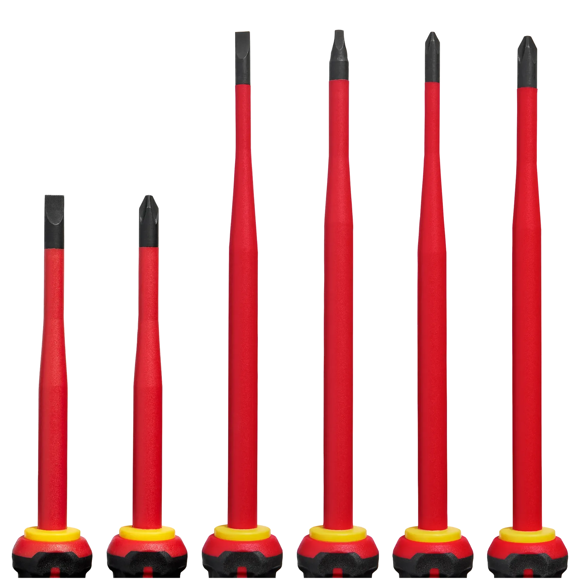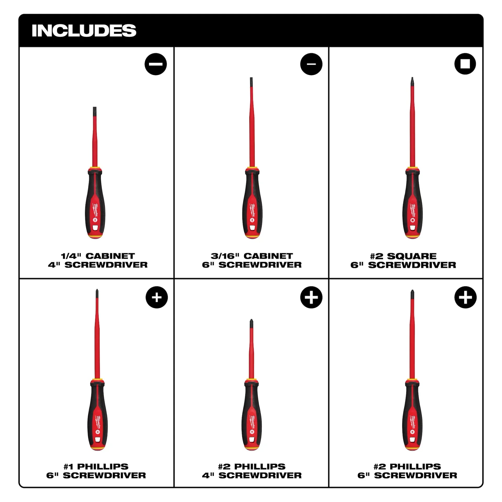 - Includes Insulated Slim Tip Screwdrivers in sizes: 1/4" Cabinet x 4", #2 PH x 4", 3/16” Cabinet x 6”, #2 Square x 6”, #1PH x 6", #2 PH x 6"