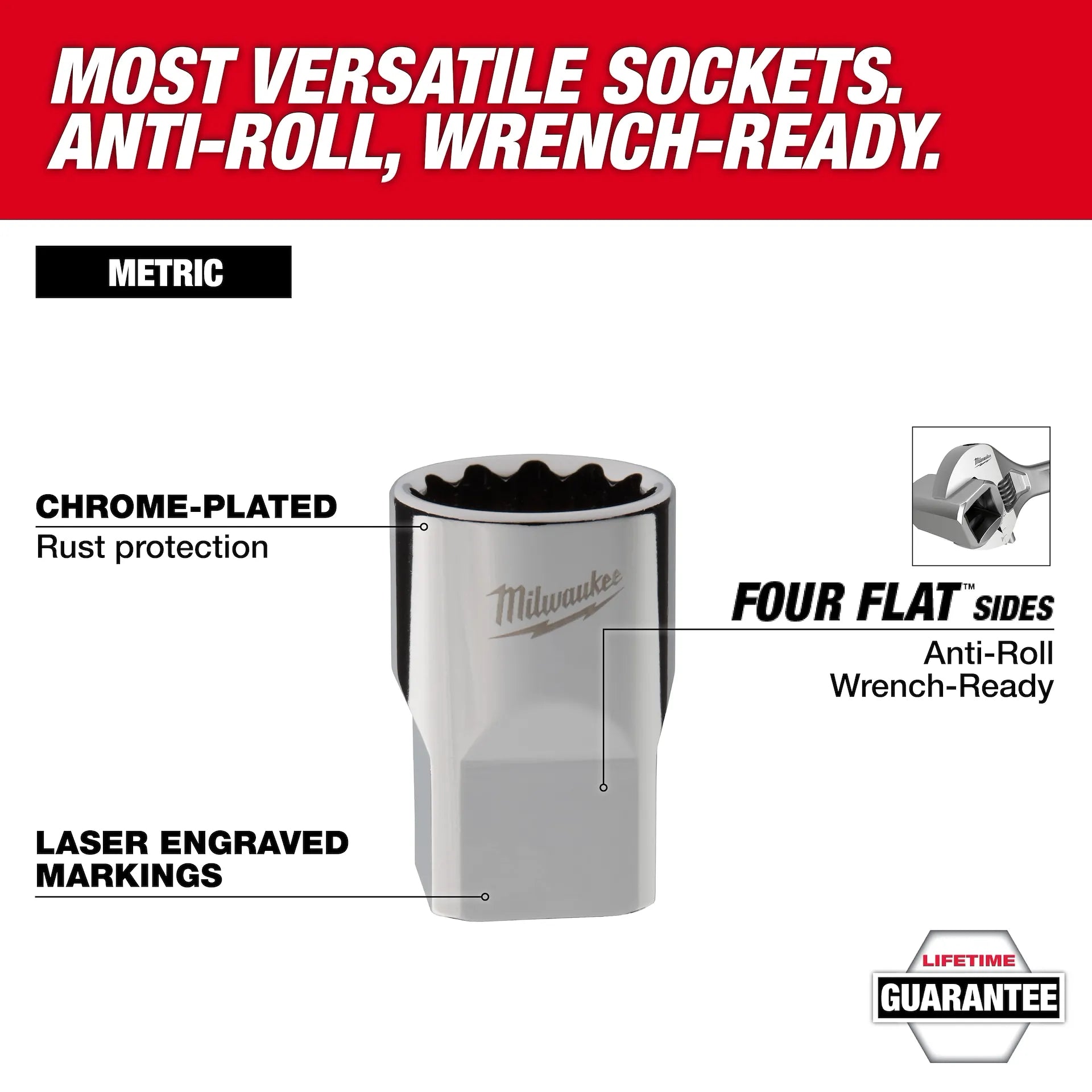 The 13pc 1/2" Drive 12-Point SAE or Metric Socket Set with FOUR FLAT™ sides is designed from the ground up to be part of the most versatile socket family. Milwaukee® sockets feature an innovative design with four parallel flat sides, which deter rolling and are wrench compatible. The laser-engraved size markings provide easy identification, and chrome plating offers rust and corrosion protection. This set includes a storage rail for better organization. All Milwaukee® sockets are backed by a Lifetime Guarantee.