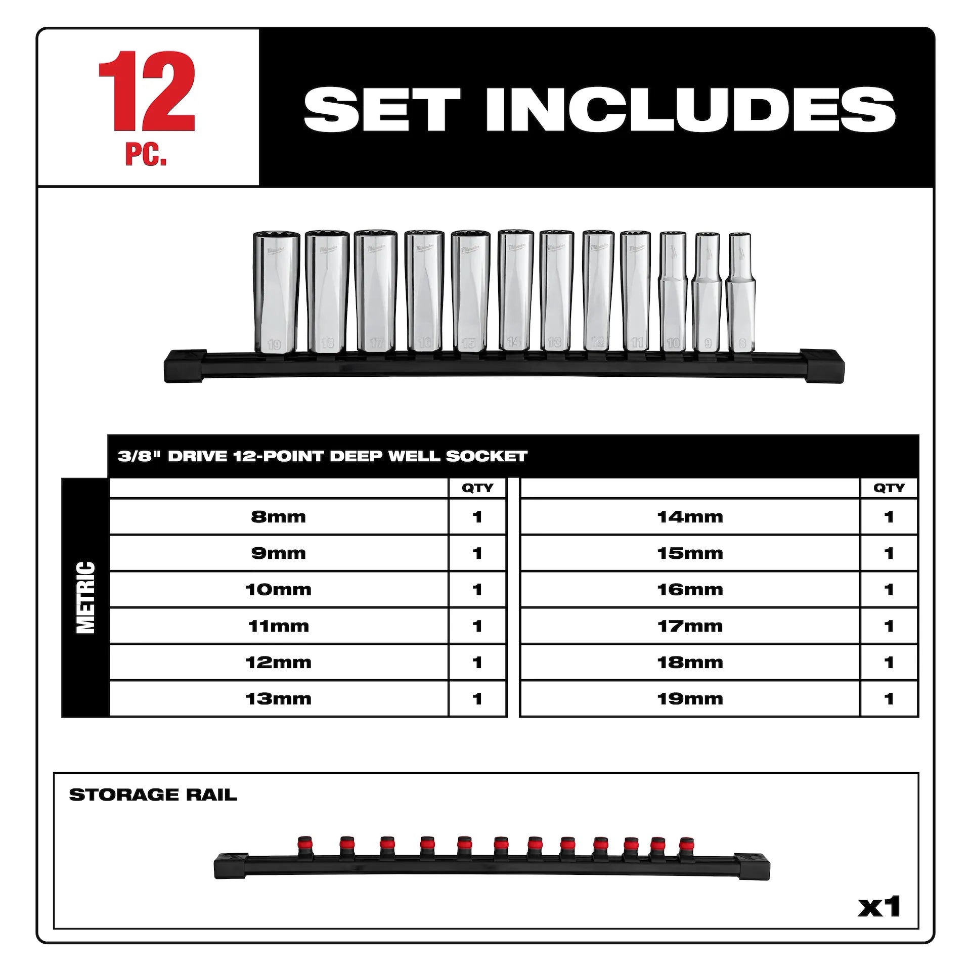 The 12pc 3/8" Drive 12-Point SAE or Metric Deep Well Socket Set with FOUR FLAT™ sides is designed from the ground up to be part of the most versatile socket family. Milwaukee® sockets feature an innovative design with four parallel flat sides, which deter rolling and are wrench compatible. The laser-engraved size markings provide easy identification, and chrome plating offers rust and corrosion protection. This set includes a storage rail for better organization. All Milwaukee® sockets are backed by a Lifetime Guarantee.