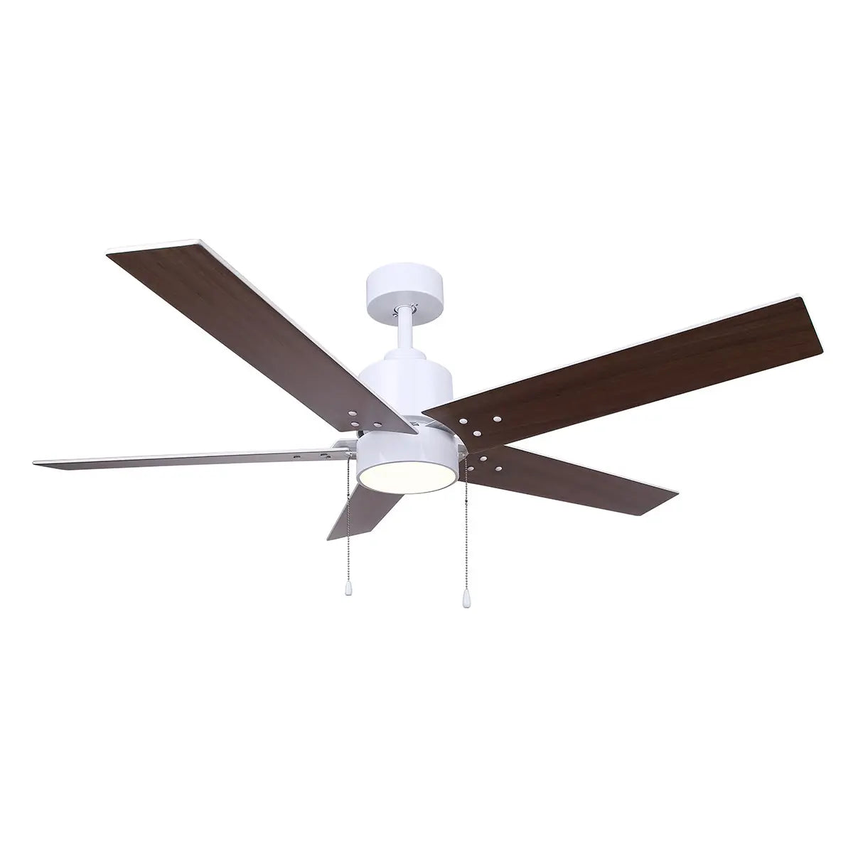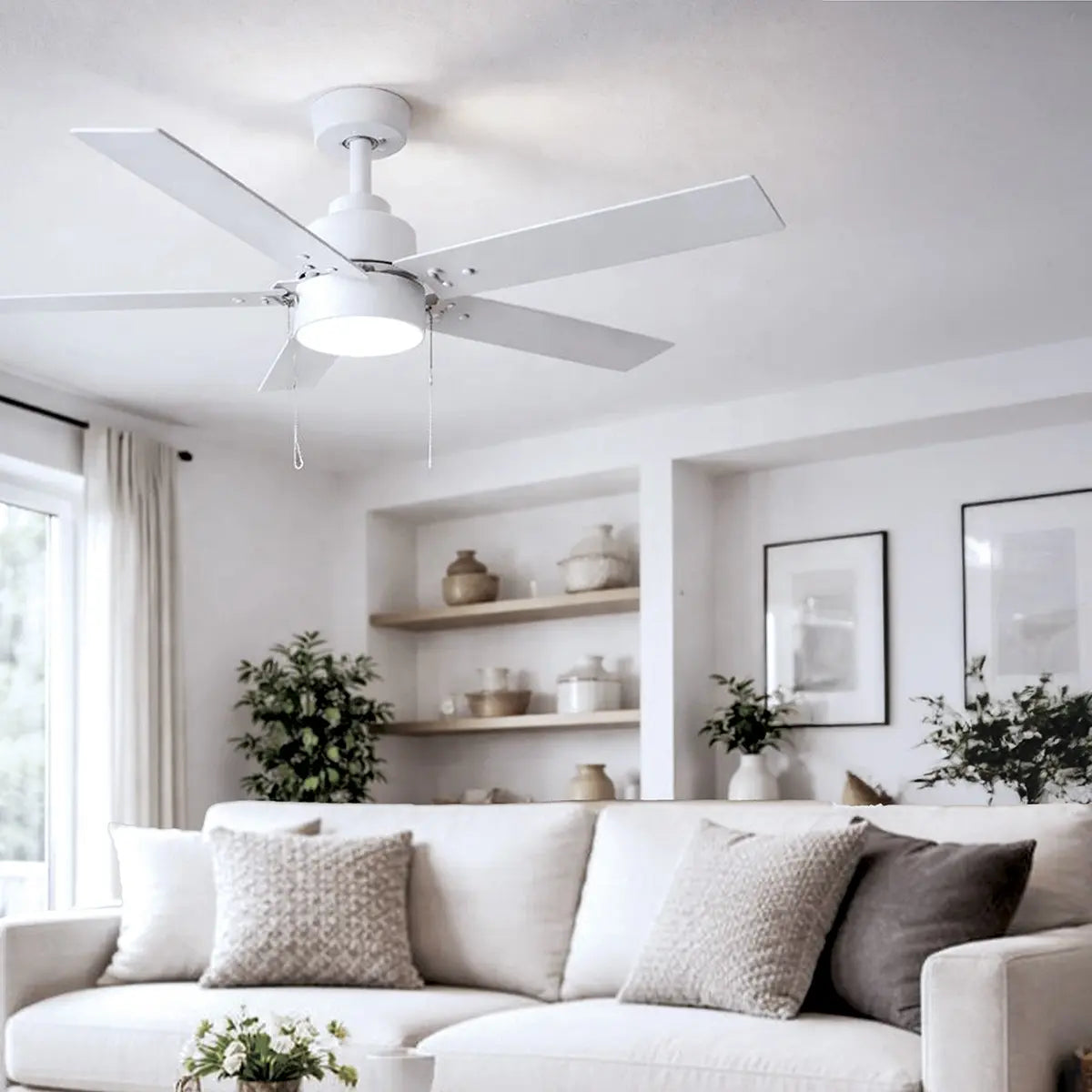 The ROMY 52-inch LED ceiling fan blends clean, modern lines with durable everyday functionality. The matte white finish and reversible blades in white and blonde maple provide a versatile style suitable for any interior. Meanwhile, the built-in 20W dimmable LED light with an acrylic diffuser delivers warm, evenly distributed illumination. Energy Star rated for efficiency, ROMY delivers both performance and style. The downrod mount and pull-chain operation make installation straightforward, ideal for builders, renovators, and DIYers alike. A quiet, modern fan that enhances airflow, comfort, and ambiance without overpowering the room.